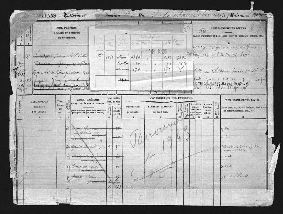 Pour découvrir l'histoire de sa maison ou de son immeuble, les fiches auxiliaires cadastrales vous apporteront de précieux renseignements : noms des propriétaires et des occupants successifs, numéro de parcelles et section, parfois dates des actes de vente ... Elles couvrent la période de 1860 à 1988. Un première partie vient d'être numérisée et mise en ligne. La suite sera disponible d'ici 2013-2014.