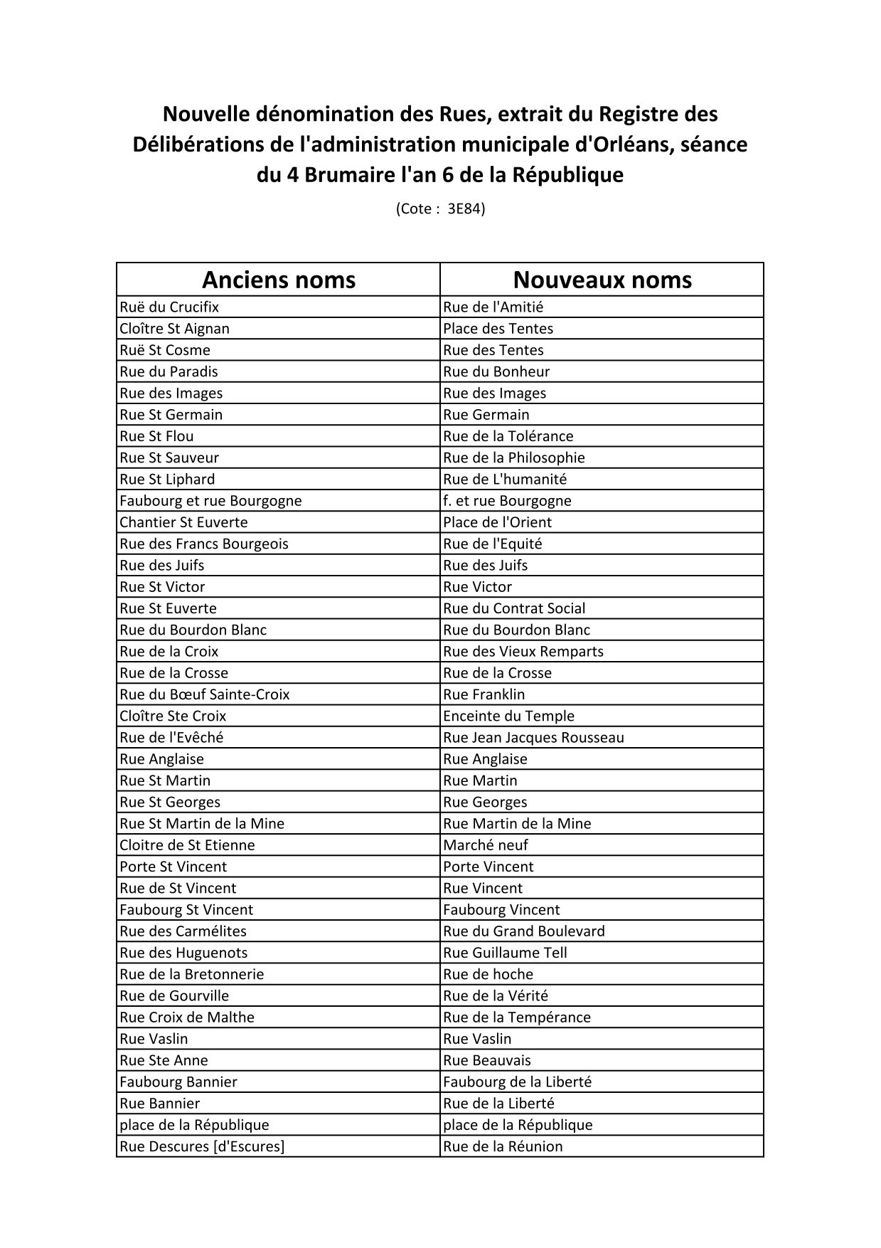 C'est au détour des travaux de classement des registres de déclaration de naissances et décès aux commissaires de police que les archivistes sont tombées sur une pièce originale et pour le coup, très utile : un tableau listant la "Nouvelle Dénomination des Ruës, extrait du Registre des Délibérations de l'administration municipale d'Orléans, séance du 14 Brumaire L'an 6 de la République", autrement dit le 4 novembre 1797.