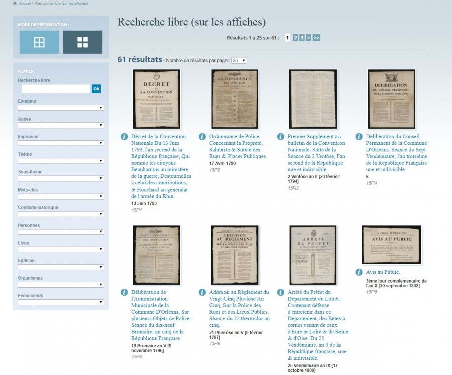 Pour chercher dans les affiches, plusieurs critères sont interrogeables via un moteur à facettes. La restitution des résultats est proposée sous forme de tableau, de mosaïque et sous forme de frise. Afin de naviguer autrement dans la collection, nous vous proposons également un accès thématique.