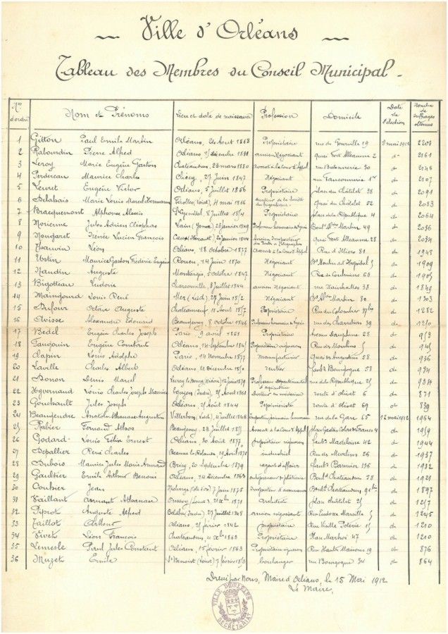 Dans la sous-série 1K, on trouve également les documents relatifs à l'organisation des élections notamment des listes de candidats et, selon les périodes, des professions de foi. Des dossiers d'installation du Conseil municipal donnent la liste des élus par mandat, évoquent les démissions et dissolutions éventuelles. Nous y conservons également quelques dossiers individuels d'élus et quelques notices biographiques.