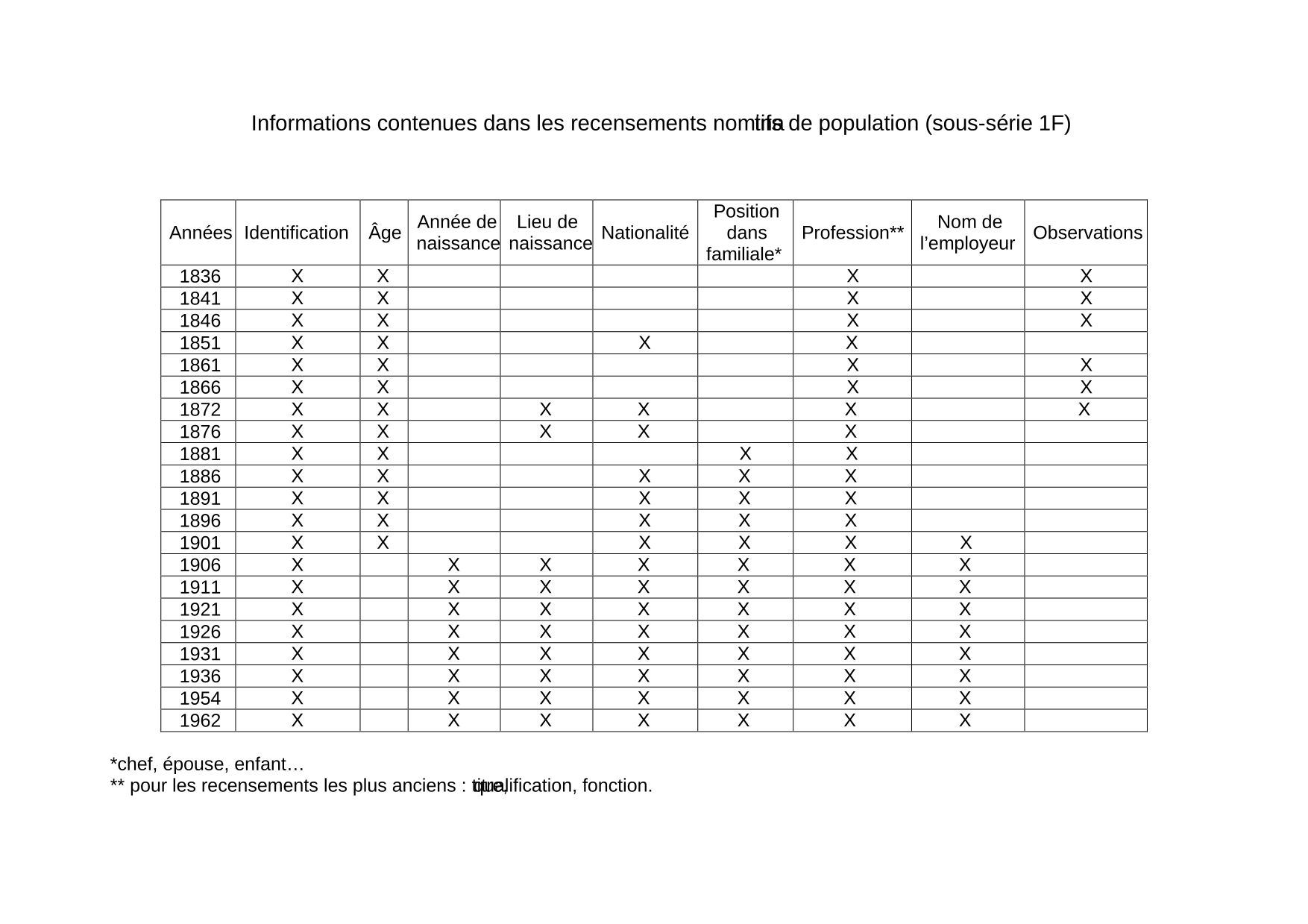 Les informations s'étoffent progressivement au fil de l’histoire des recensements. Ainsi :