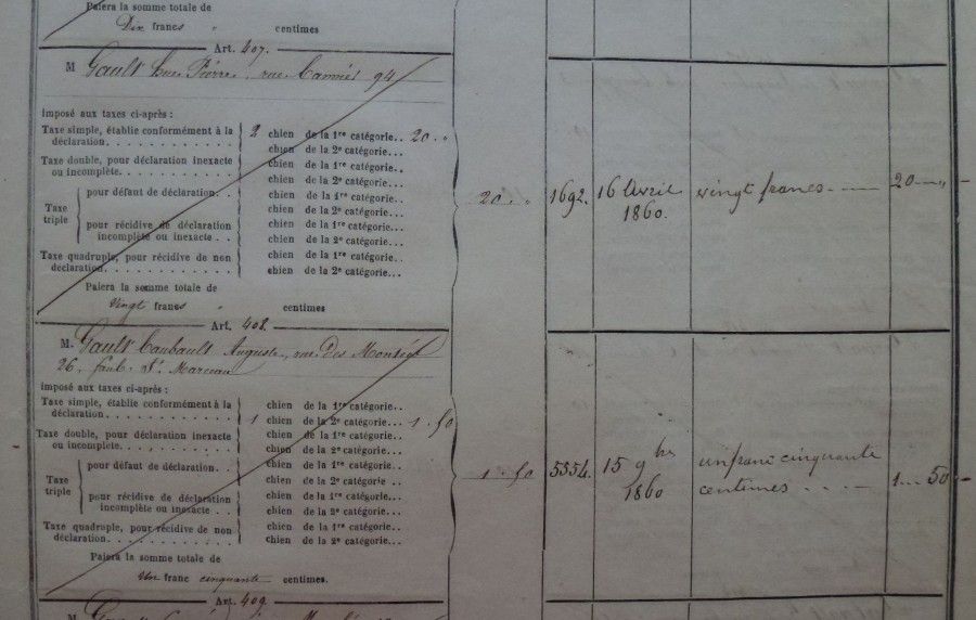 Cette taxe est instaurée par la loi du 2 mai 1855, par le décret du 4 août de la même année et précisée par celui du 9 janvier 1856. Elle est perçue annuellement par les communes sur les propriétaires de chien. D’après les registres conservés, ces animaux sont répartis en deux catégories. La première concerne les chiens d’agrément ou servant à la chasse. Pour ces bêtes, la taxe est de 10 Francs par an. La seconde est réservée aux chiens guidant les aveugles, à ceux qui servent à garder les troupeaux, les habitations, les magasins, les ateliers et tous les autres cas non prévus dans la première catégorie. Pour ces animaux, la taxe s’élève à 1,50 Francs.