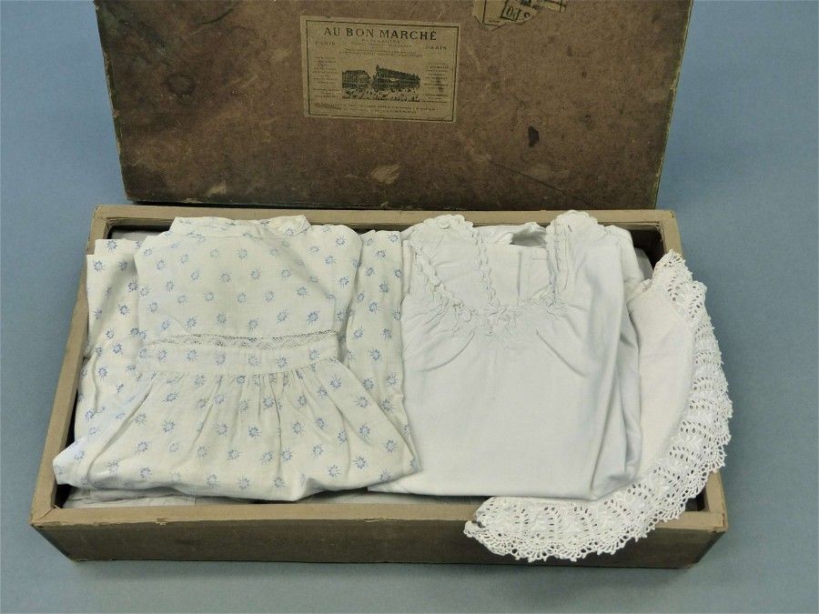 Mais le cartable, la trousse et son contenu ne vont pas être les seules exceptions à nos règles d’archivistes. Les héritiers d’André Coffrand nous présentent finalement une grande boîte marquée d’une publicité pour le magasin Le Bon Marché, à Paris. A l’intérieur, délicatement plié, on retrouve tout un ensemble de layette qui date du début des années 1920. On nous explique qu’il s’agit probablement de la propre layette d’André Coffrand, qu’il devait lui-même tenir de ses parents. Les héritiers ne se résolvent pas à jeter les marques d’un souvenir conservé si pieusement et nous demandent de prendre en charge la boîte et son contenu, charge à nous de conserver ces vêtements ou de trouver une institution à même de les recevoir.