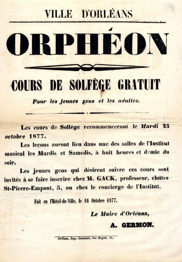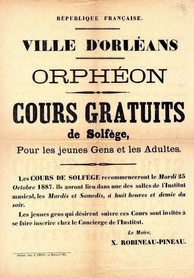 Les affiches administratives annoncent à la population différents cours pour adultes. Entre autres, on retrouve des affiches relatives à l'orphéon. Ce mot tombé en désuétude désigne à l'origine un groupe de chant-chorale composé exclusivement d’enfants, ouvert par la suite aux hommes jeunes pour remplacer les maîtrises religieuses supprimées suite à la révolution de 1789. Ce nom d’orphéon provient de l’hommage que Guillaume-Louis Bocquillon (1781-1842), musicien et compositeur plus connu sous le nom de Wilhem, veut rendre au héros de la mythologie grecque Orphée, poète et musicien. Wilhem crée le premier orphéon en 1833 à Paris. Il lance ainsi un mouvement qui va se développer partout en France avec la création de sociétés chorales ou orphéoniques subventionnées par des entreprises ou les municipalités. Elles étaient constituées de chanteurs issus des classes moyennes ou populaires. En France, jusqu’en 1908, les orphéons ne sont accessibles qu’aux hommes. A partir de cette date, ces chorales s’ouvrent aux femmes et deviennent des orphéons mixtes.