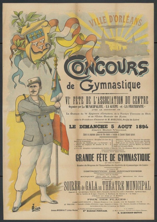 Pour agrémenter les fêtes et commémorations, la municipalité organise des concours de gymnastique, comme un témoigne la belle affiche lithographiée de 1894, cotée 15Fi1758. Cette manifestation est organisée par l’association orléanaise La Guêpe, société de gymnastique fondée en 1883 et La Fraternité, société de tir, créée la même année.