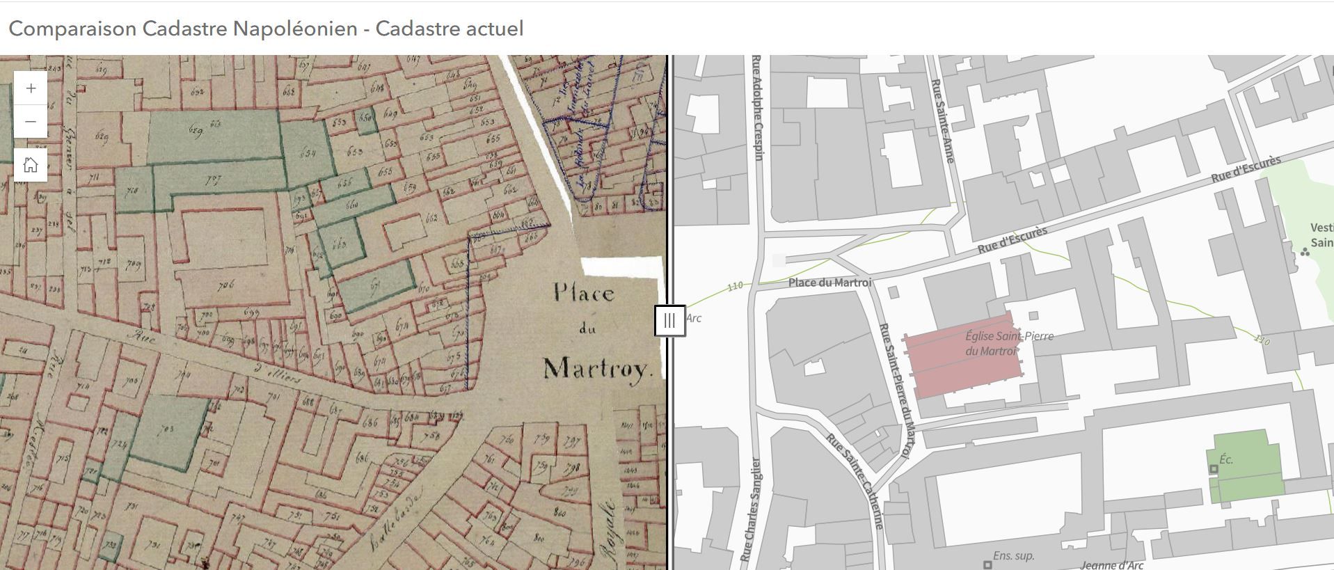 Grâce au travail du service GEOmatique d'Orléans Métropole, nous vous proposons ici une application qui vous permettra de visualiser la ville d'Orléans en 1823, à la date de réalisation du cadastre napoléonien et de comparer avec le cadastre actuel. L'outil vous permettra de vous situer dans l'espace au cours de vos recherches ou pour le simple plaisir de la découverte !