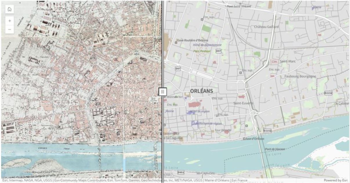 Grâce au travail du service GEOmatique d'Orléans Métropole, nous vous proposons ici une application qui vous permettra de visualiser la ville d'Orléans, en particulier dans le centre-ville avant les bouleversements engendrés par la Seconde Guerre mondiale, la reconstruction et l'urbanisation de la périphérie et de comparer avec l'état actuel. L'outil vous permettra de vous situer dans l'espace au cours de vos recherches ou pour le simple plaisir de la découverte !