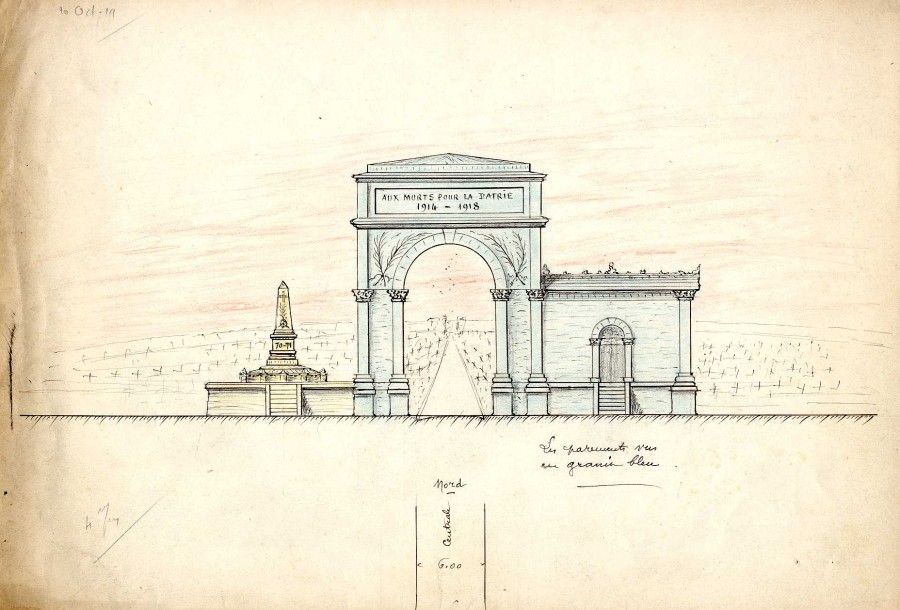 Le 23 octobre 1919, le projet est défini comme celui d’un Monument à la mémoire des habitants d’Orléans morts pour la Patrie pendant la Guerre de 1914-1918. Il devra notamment recevoir les restes des poilus inhumés dans le cimetière militaire. Fernand Rabier, maire d’Orléans, souhaite que le monument soit érigé dans la perspective principale du Grand Cimetière de la Ville. L’idée est de déplacé le monument existant de la Guerre de 1870 afin que les deux monuments soient en face l’un de l’autre. Un concours doit être ouvert à l’attention des architectes et des artistes. Le monument devra se composer d’un ossuaire en partie inférieure. Sur la partie haute, il est prévu un espace devant recevoir des tables de marbre sur lesquelles seraient gravés les noms des 3 500 habitants de la ville morts au Champ d’Honneur. Cette seconde partie doit être d’accès facile afin que le public puisse venir se recueillir le 2 novembre de chaque année.