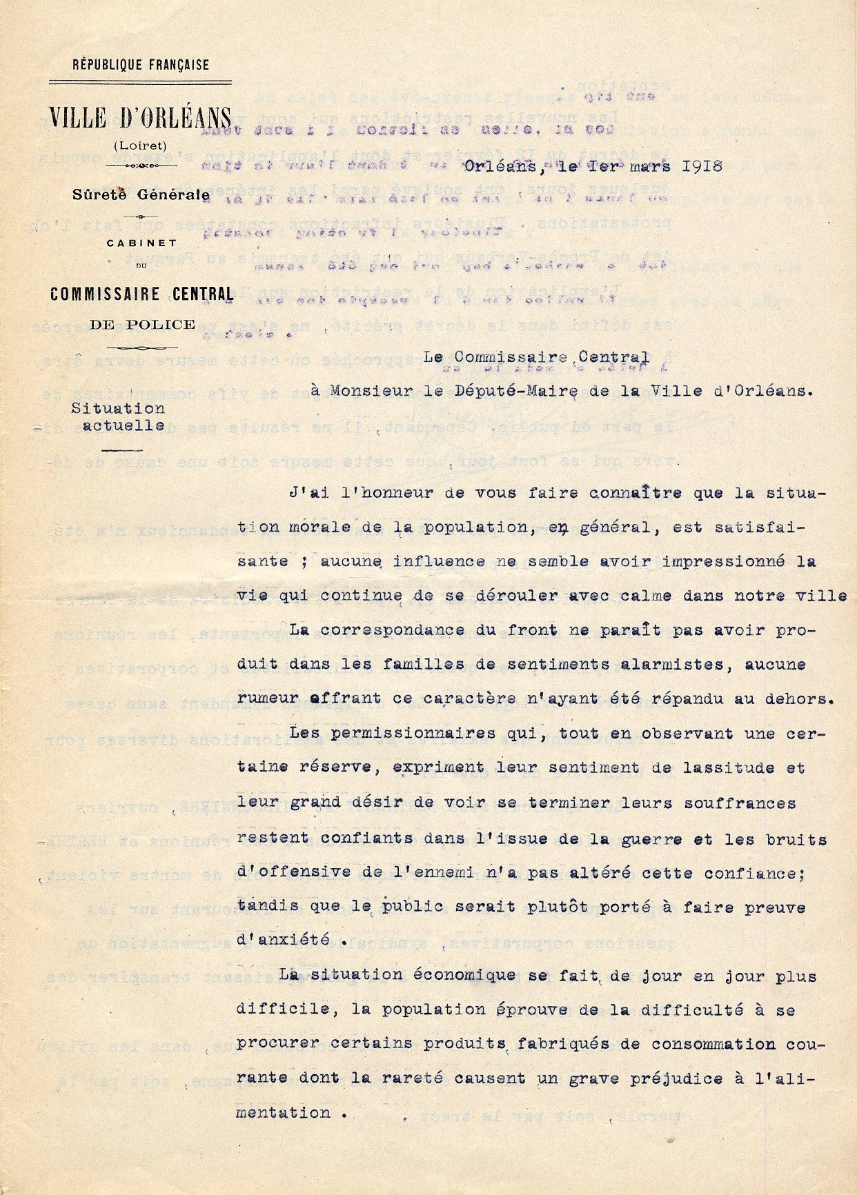 Ainsi les policiers municipaux rédigent le 1er mars 1918 un rapport de situation décrivant le comportement de leurs concitoyens en cette période de crise. Ils se veulent d'ailleurs rassurants : les Orléanais sont calmes.