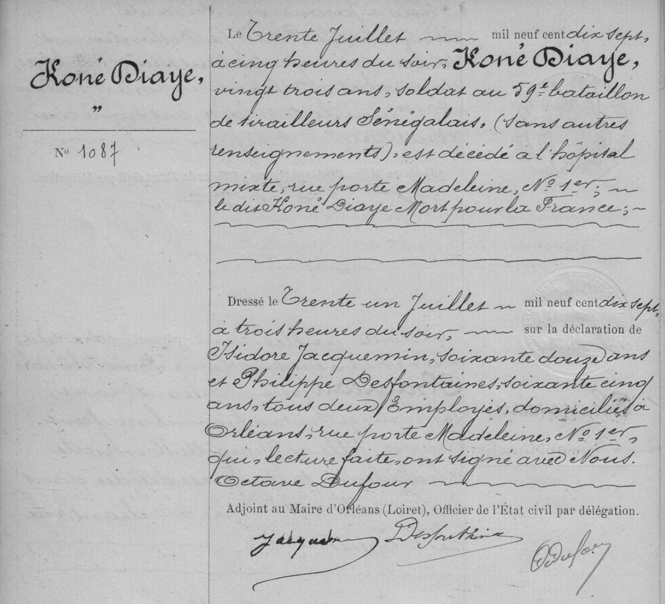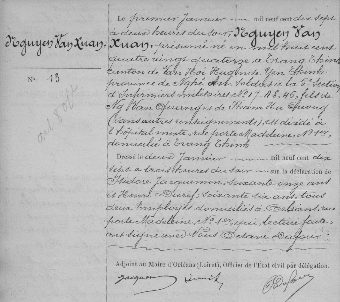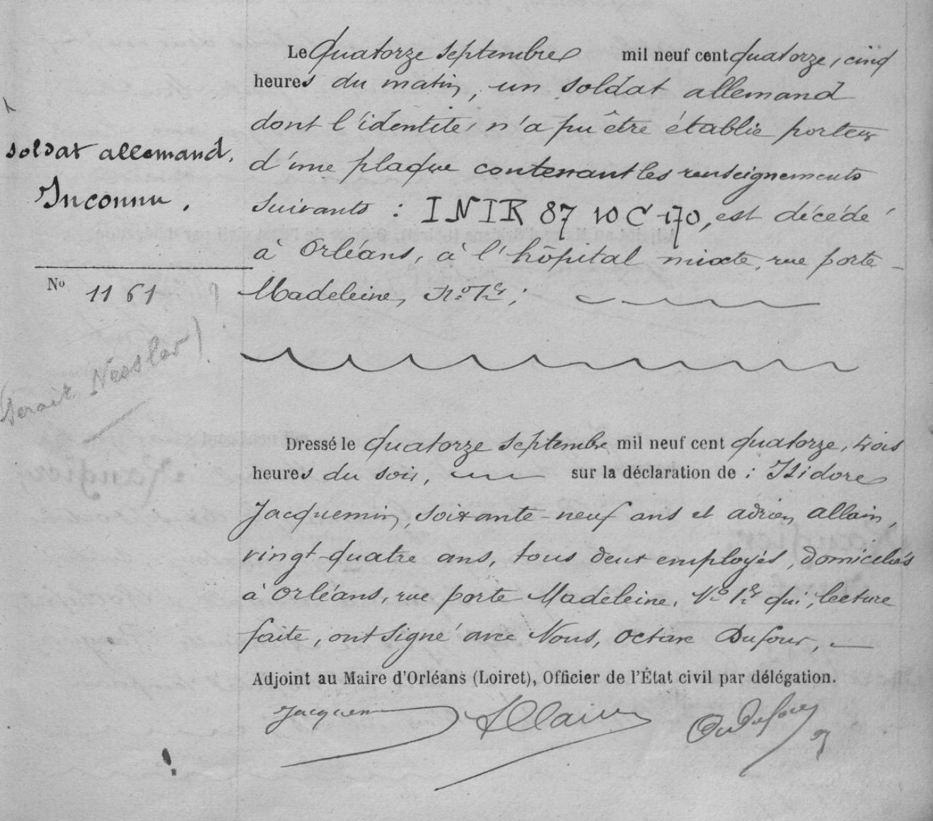 Le décès des Orléanais morts au front est systématiquement transcrit dans les registres de décès de la commune. Par ailleurs, même si la ville n'est pas dans la zone des combats, de nombreux soldats meurent dans les ambulances ou hôpitaux auxiliaires orléanais. Ainsi, ces décès sont également enregistrés dans les registres d'état civil de la commune. En les feuilletant, on découvre le nom de soldats de différentes nationalités, dont des Allemands, qui décèdent loin du front et, par là même, loin de chez eux. On retrouve également quelques travailleurs chinois venus à Orléans pour le compte de l'Armée française.