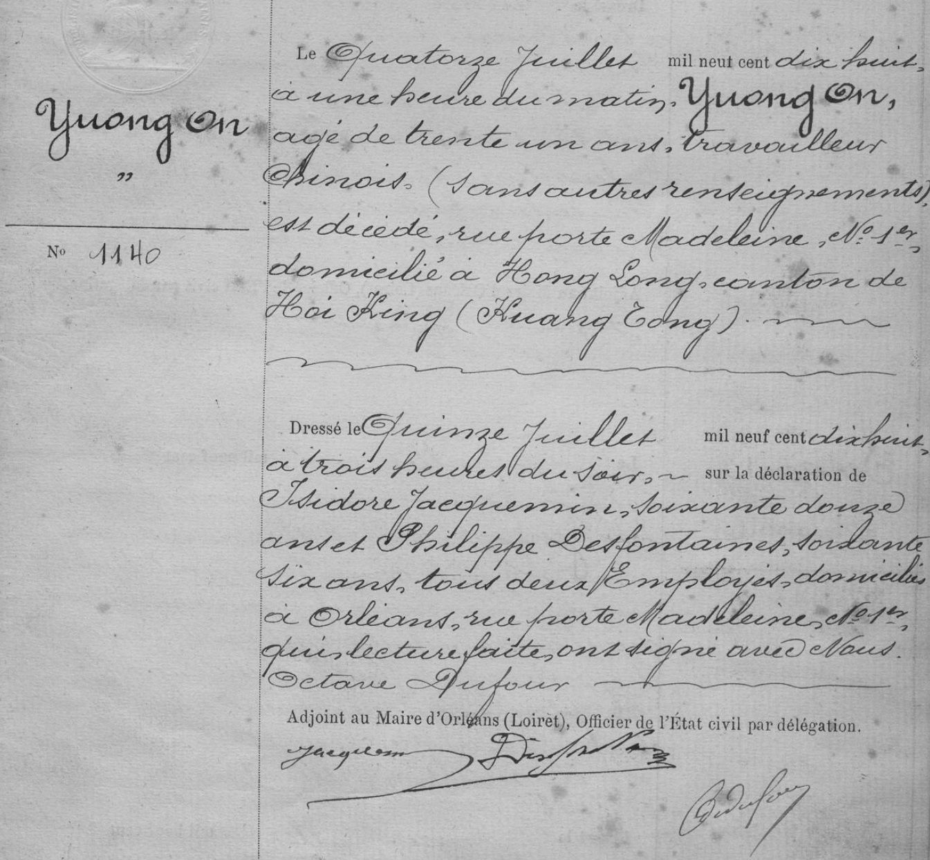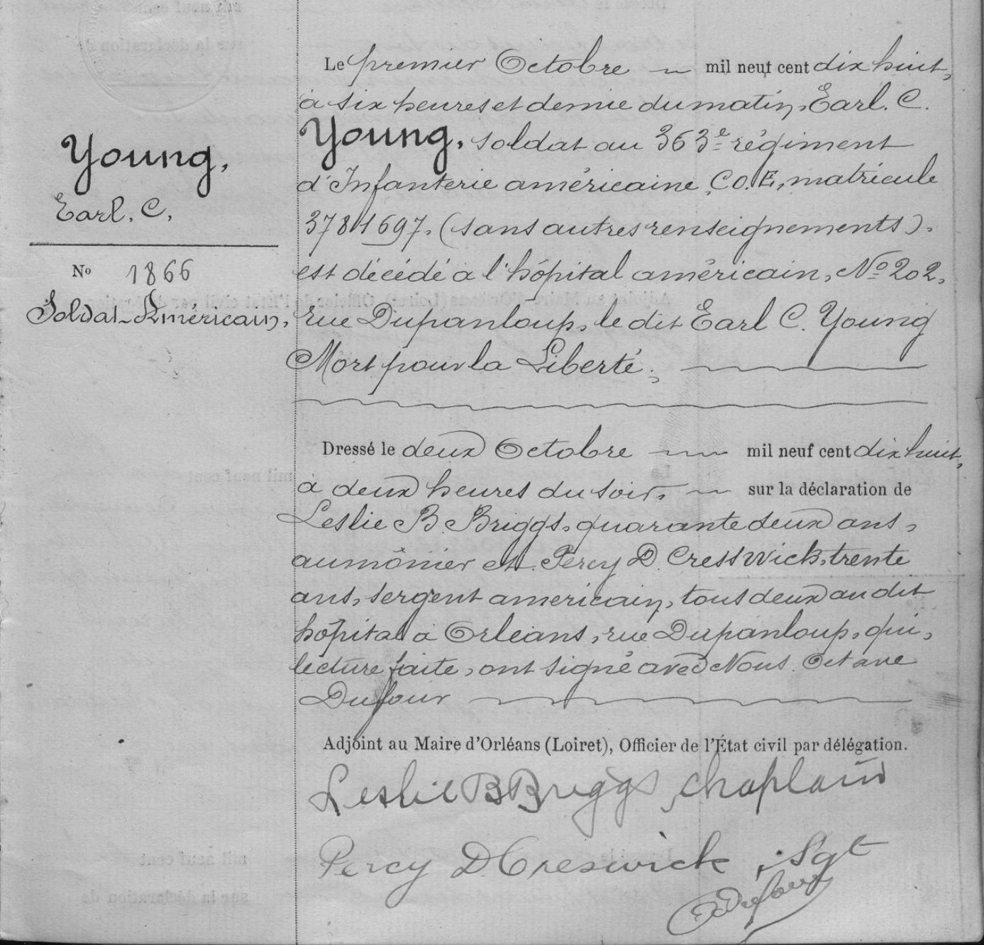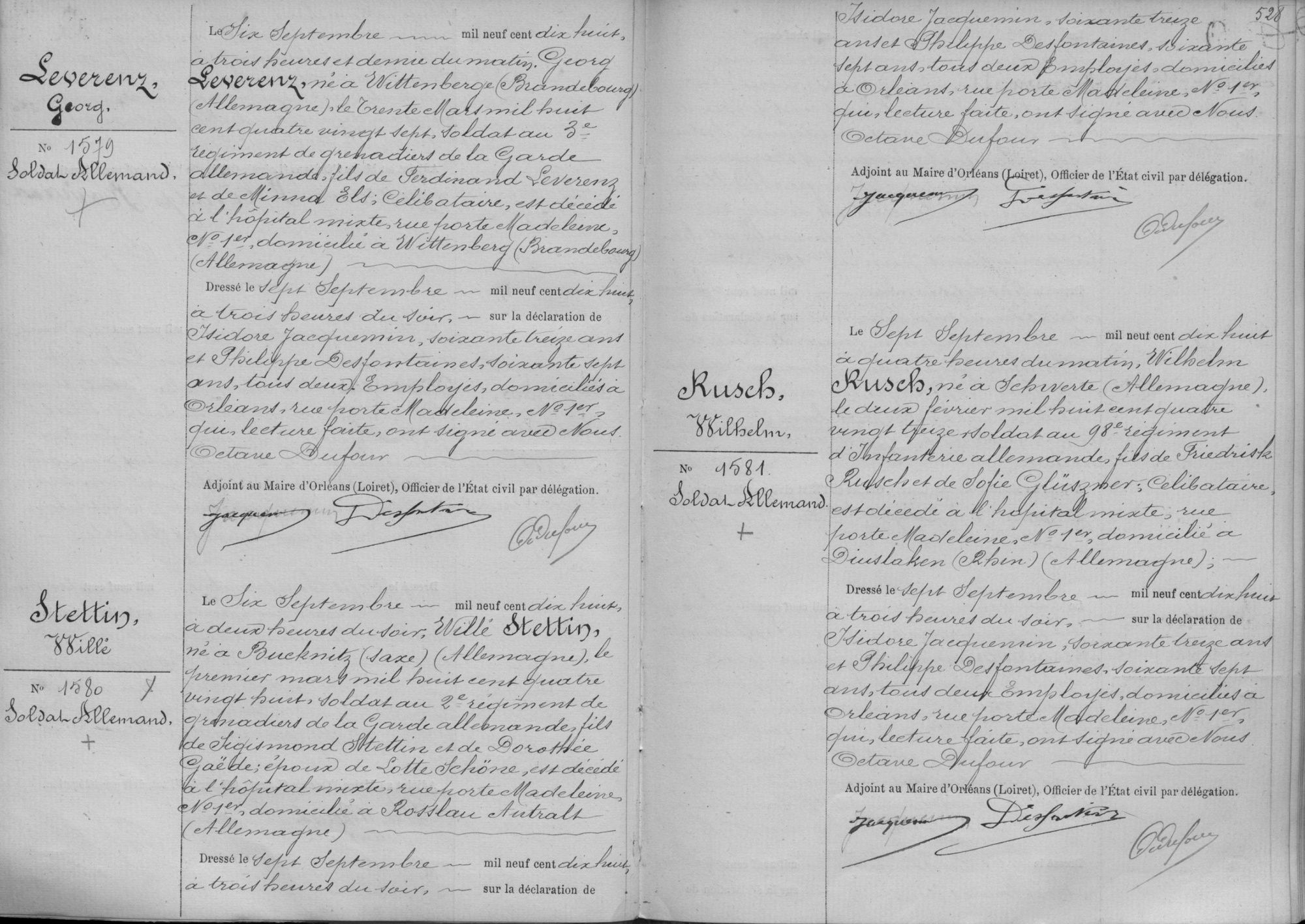 Le décès des Orléanais morts au front est systématiquement transcrit dans les registres de décès de la commune. Par ailleurs, même si la ville n'est pas dans la zone des combats, de nombreux soldats meurent dans les ambulances ou hôpitaux auxiliaires orléanais. Ainsi, ces décès sont également enregistrés dans les registres d'état civil de la commune. En les feuilletant, on découvre le nom de soldats de différentes nationalités, dont des Allemands, qui décèdent loin du front et, par là même, loin de chez eux. On retrouve également quelques travailleurs chinois venus à Orléans pour le compte de l'Armée française.
