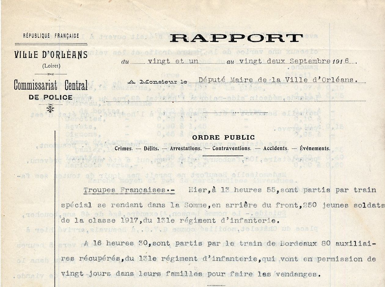 Classés chronologiquement, les rapports permettent de suivre l'avancée du conflit. La police municipale détaille les arrivées, départs et transits des trains en gare d'Orléans en comptabilisant précisément le nombre et la nationalité des soldats arrivant du front ou en partance ; le nombre et la nationalité des blessés, précisant parfois le lieu de la bataille ou la nature de leur blessure (gaz) ; le nombre et l'origine des réfugiés.