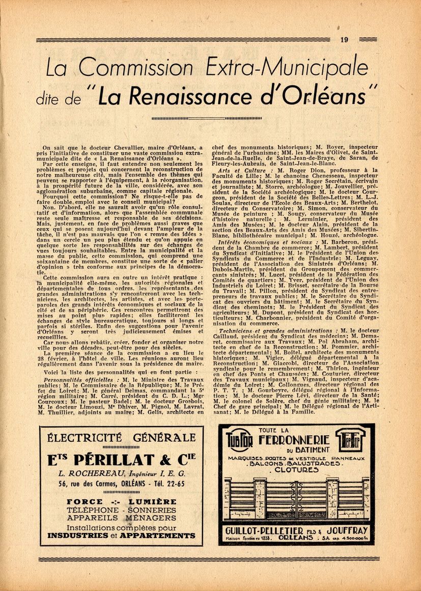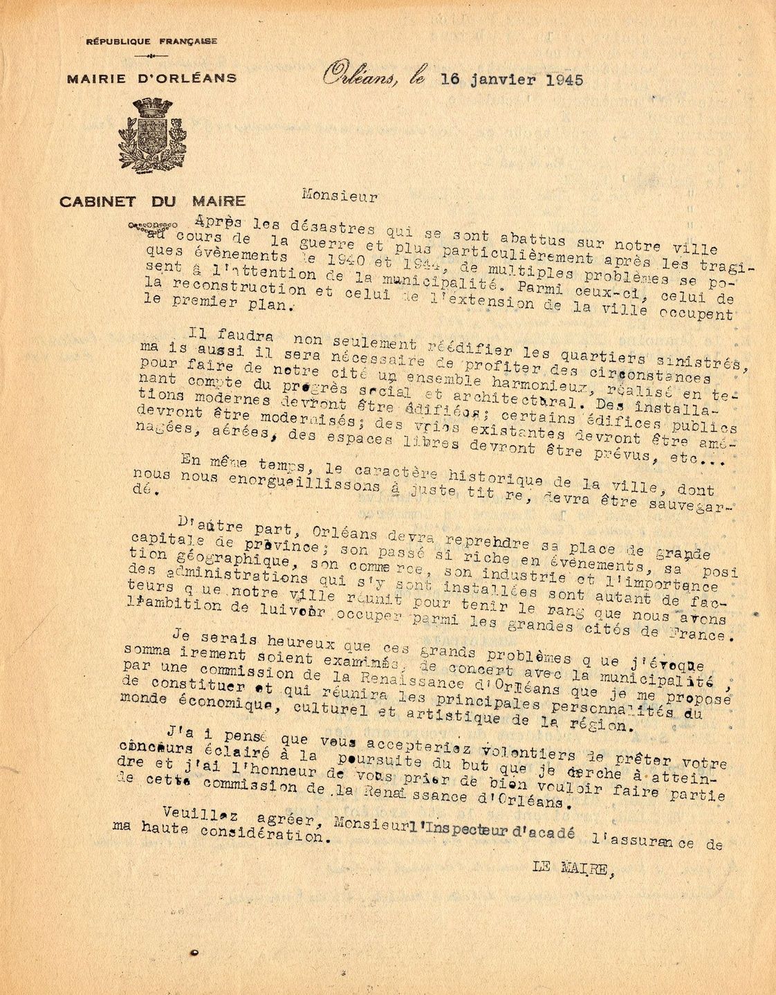 En 1945, la reconstruction est l’affaire d’une étroite collaboration entre le Ministère à la Reconstruction et l’Urbanisme et les municipalités. Sans rejeter en bloc le plan de 1940 qu’il qualifie de « plan de la défaite », Pierre Chevallier, maire d’Orléans, se place du côté des novateurs et œuvre pour une révision. Le 19 janvier 1945, face au conseil municipal, il indique que depuis un siècle, la ville a suivi un développement chaotique, qu’il faut « profiter naturellement de la catastrophe (…) pour sortir de ce marasme » et « faire d’Orléans une ville moderne, digne de son passé ». Pierre Chevallier lance parallèlement une commission extra-municipale dite « de la Renaissance d’Orléans », composée de près de 75 personnalités issues des milieux politique, culturel, économique, touristique ou encore militaire. Elles ont pour mission de se prononcer sur les projets développés dans le plan voire de suggérer de nouvelles idées.