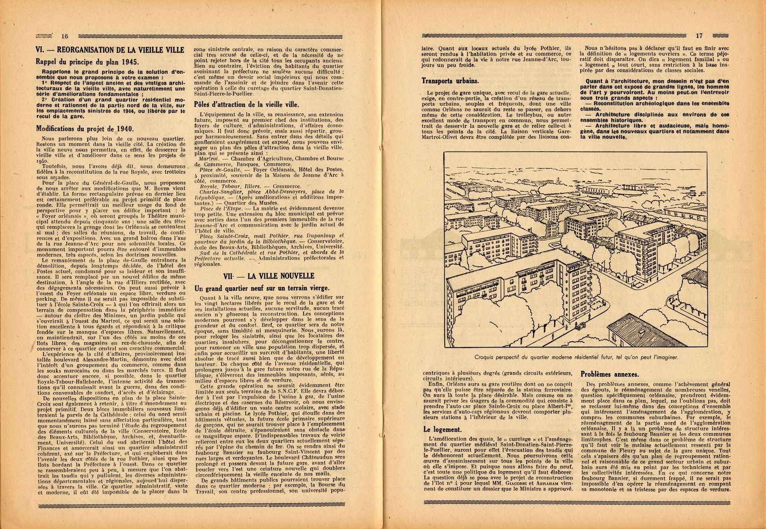 Le Front national des architectes, mené par Le Corbusier, critique vivement le plan d’Orléans établi en 1940. Les principaux griefs évoquent une mauvaise répartition des terrains, l’insuffisance d’espaces libres, le manque de liaison avec l’extérieur, l’absence de prise en compte du développement de l’automobile. En outre, ils indiquent aussi qu’il faut envisager l’accroissement de la population, exploiter la proximité de la Loire et traiter la ville à l’échelle régionale.