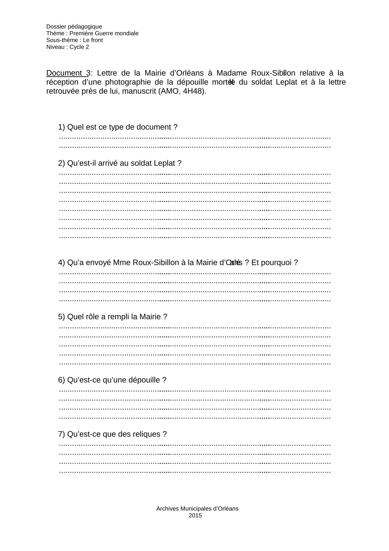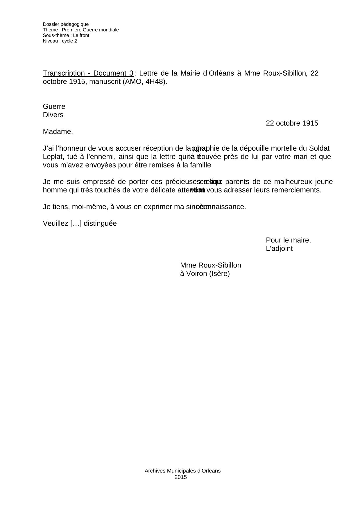 Ce document est un brouillon d’une lettre adressée par la Mairie d’Orléans à Madame Roux-Sibillon. Son mari, soldat au front, lui a adressé une lettre retrouvée près du soldat Leplat ainsi qu’une photographie de ce poilu mort afin qu’elles soient données à la famille de ce dernier. La Mairie s’est chargée de remettre ces documents à la famille. Très souvent, les familles de poilus étaient informées de la mort d’un proche par un camarade et de façon officieuse, avant une annonce plus officielle de l’Armée. L’envoi d’une photographie et d’objets personnels du défunt atteste alors d’une mort certaine, et constitue, dans une certaine mesure, un réconfort, pour les familles qui ne peuvent pas récupérer les corps de leurs proches morts au front.