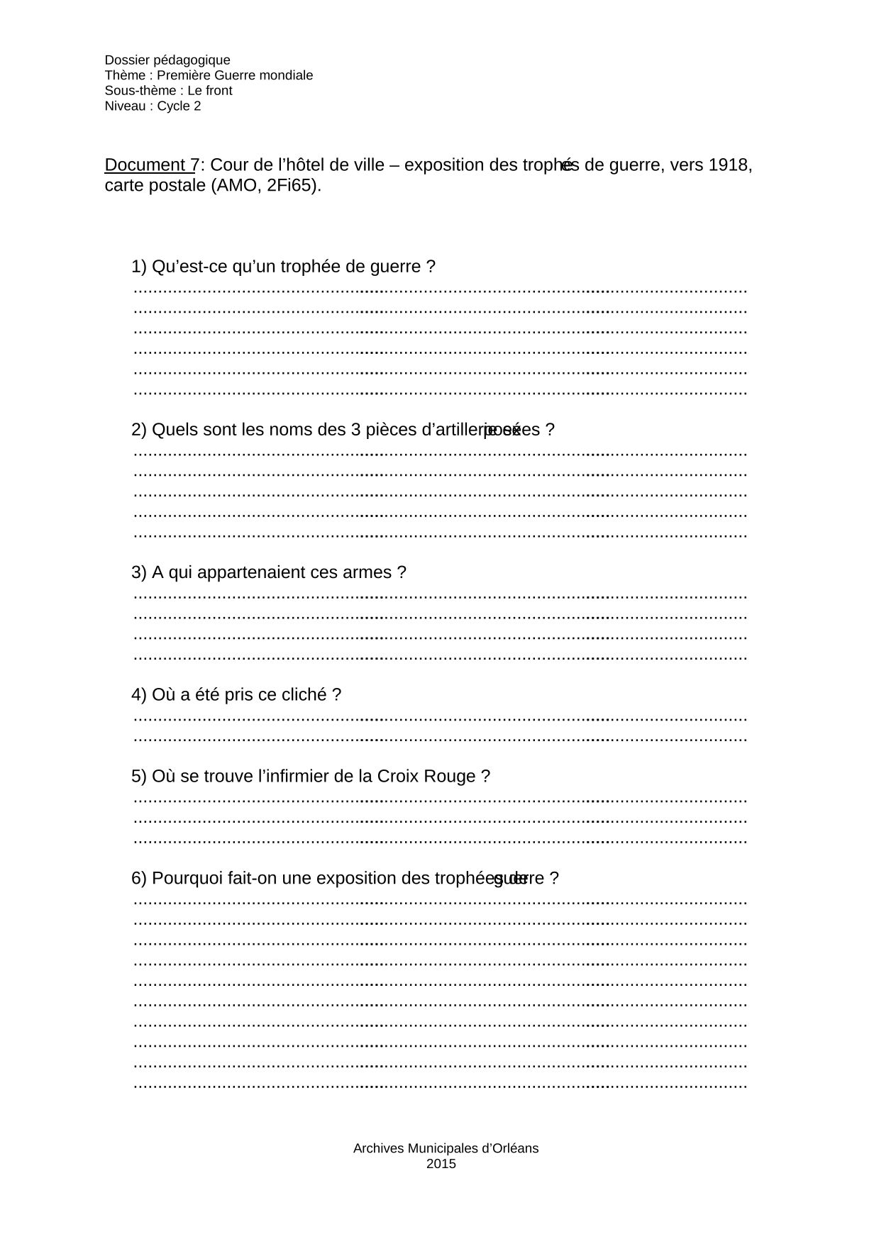 Contexte : L’exposition des trophées de guerre pris à l’ennemi est un moyen de montrer les victoires de l’Armée à la population, de lui redonner courage et d’exacerber son patriotisme. C’est également un moyen de montrer l’armement et de lever des fonds grâce à des troncs (boîte fermée et fixe, munie d’une fente pour recevoir les dons), généralement placés à côté des trophées, pour motiver les dons. Cette carte postale montre l’exposition des trophées de guerre dans la cour de l’hôtel Groslot qui a eu lieu en février 1916.