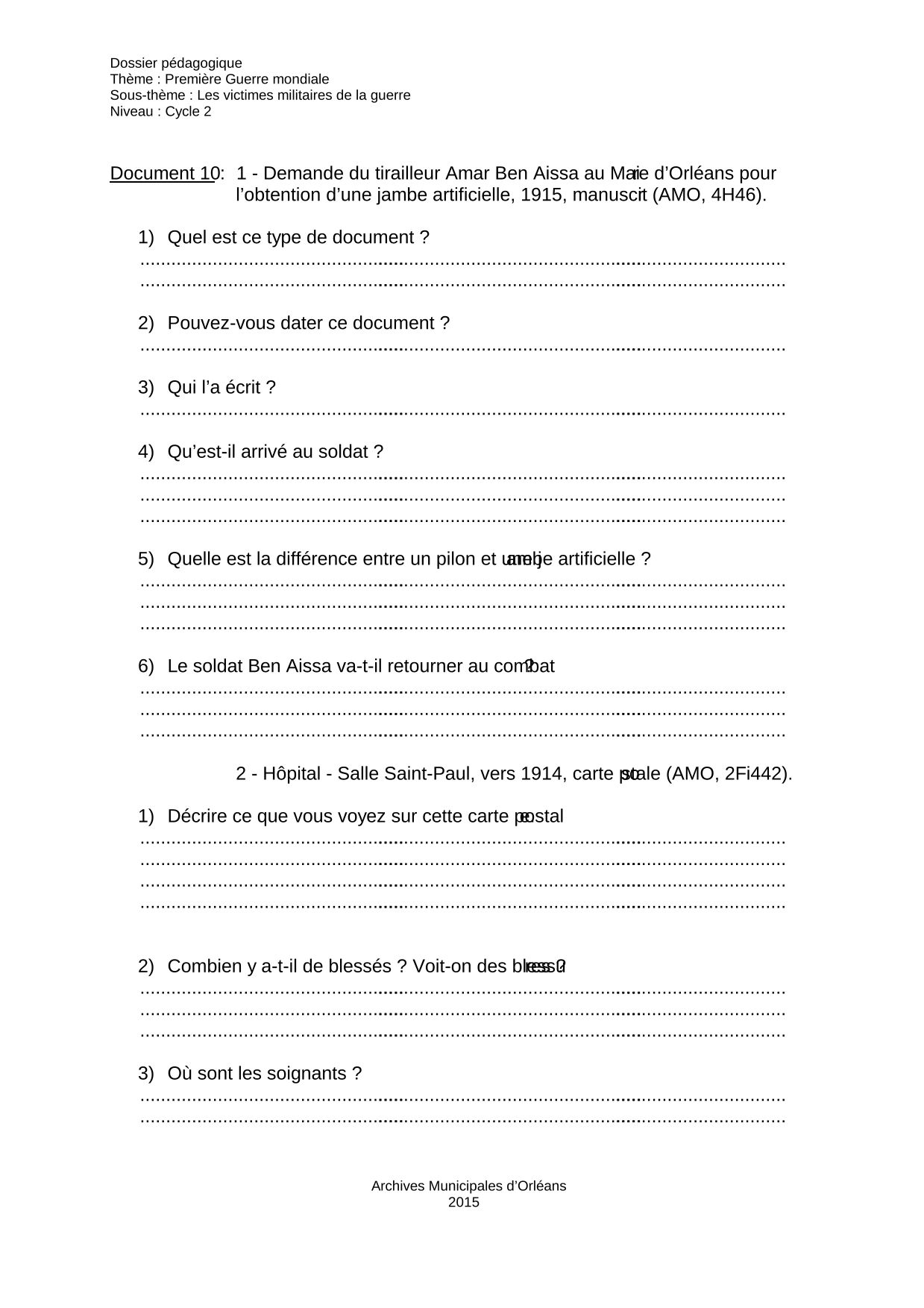 Contexte : Les hôpitaux d’Orléans accueillent les blessés du front dans des salles spécifiques à l’hôpital, comme la salle Saint-Paul, représentée sur cette carte postale, ou dans des écoles. Les hommes meurent au front mais aussi dans ces hôpitaux, loin du front. A Orléans, les blessés peuvent demander de l’aide auprès de la population ou du Maire. Ainsi, Amar ben Aïssa, soldat de l’Armée coloniale, écrit en 1915 au Maire car il a perdu une jambe à la guerre et souhaite pouvoir obtenir une jambe artificielle à la place du pilon habituellement fourni par l’Etat.