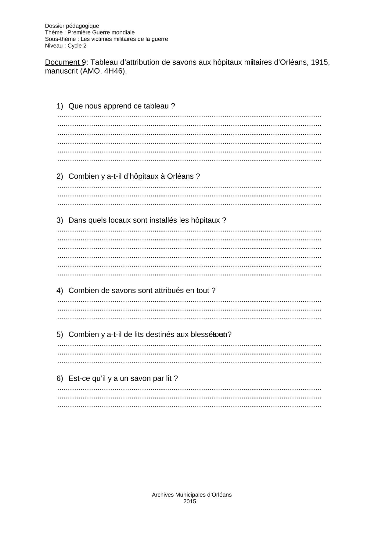 Contexte : Les hôpitaux à l'arrière accueillent les rescapés : 25 formations sanitaires sont tenues par l’Armée ou par des sociétés de secours à Orléans. Elles occupent des bâtiments publics comme les écoles, et fonctionnent notamment grâce à l’aide de la population. Ce tableau, qui comptabilise le nombre de savons attribués par rapport au nombre de lits des différents hôpitaux, permet d’évoquer la question de l’hygiène dans le milieu médical.