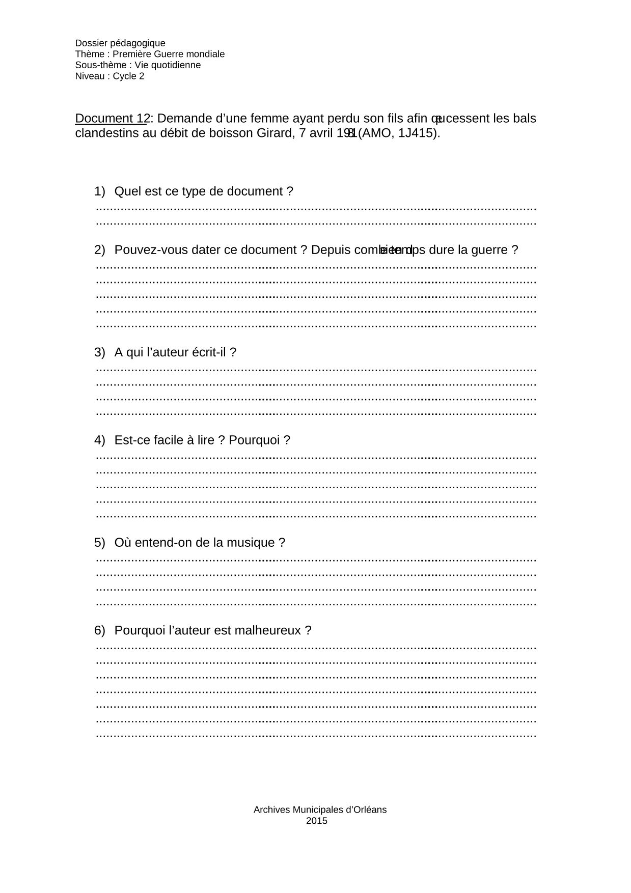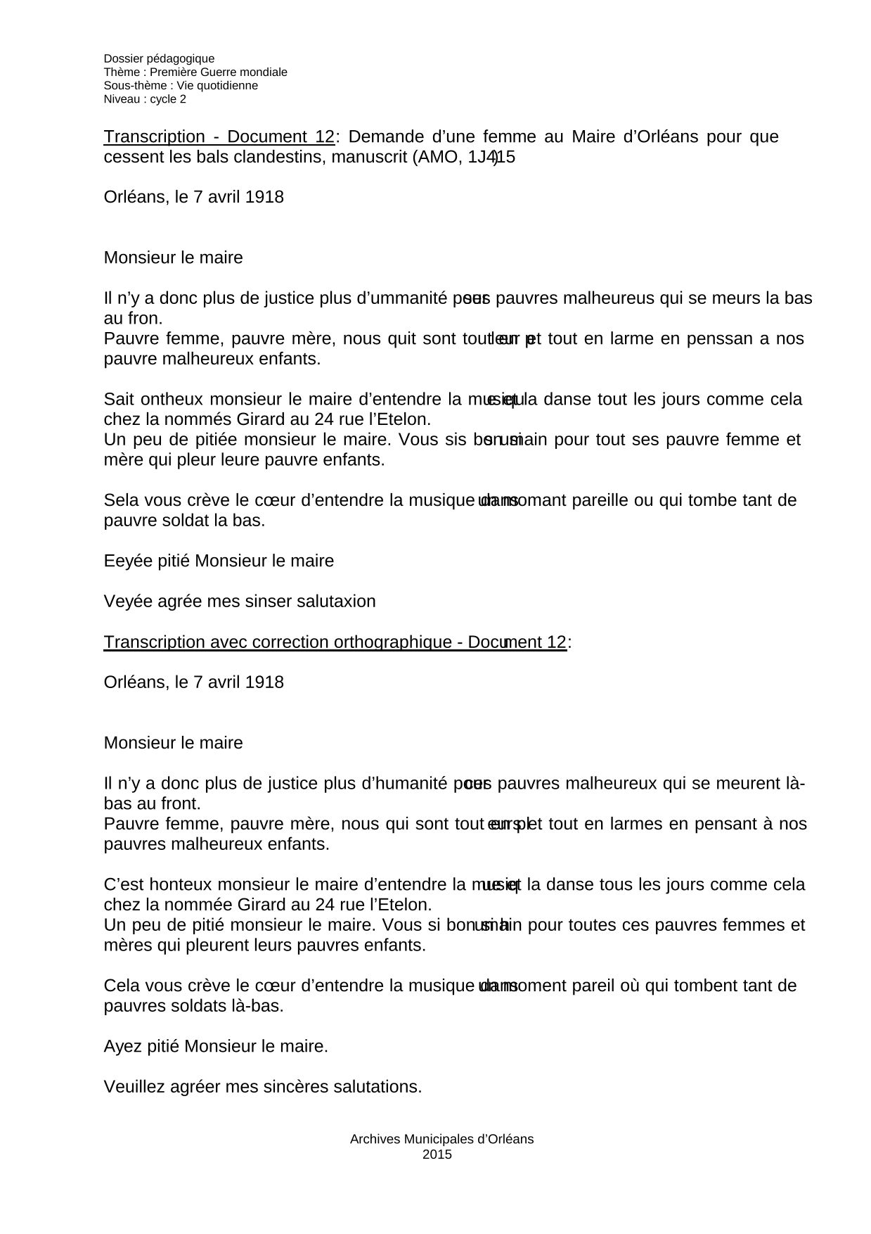 Contexte : Une lettre anonyme, rédigée par une mère ayant perdu son fils à la guerre, est adressée au Maire d’Orléans afin qu’il fasse jouer son pouvoir de police pour arrêter les bals clandestins chez la femme Girard, 24 rue de l’Etelon. A travers cette lettre, on comprend que certaines personnes ont des comportements différents face à la vie en temps de guerre : ceux qui ont besoin de faire la fête pour montrer qu’ils sont en vie, et ceux ravagés par la douleur de la perte d’un être cher.