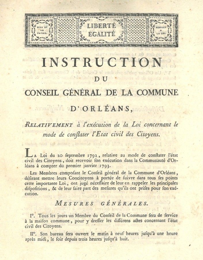 Après la Révolution, les registres paroissiaux sont remplacés par l’état civil laïc selon la loi du 20 septembre 1792. Ce sont désormais les dates des naissances, des mariages et des décès qui sont consignées sur les actes rédigés en mairie, par un officier de l’état civil et selon de nouvelles modalités fixées par la loi. A Orléans, les mesures prennent effet à compter du 1er janvier 1793, c’est la création et la mise en place du nouveau service de d’état civil dont voici un extrait du règlement :