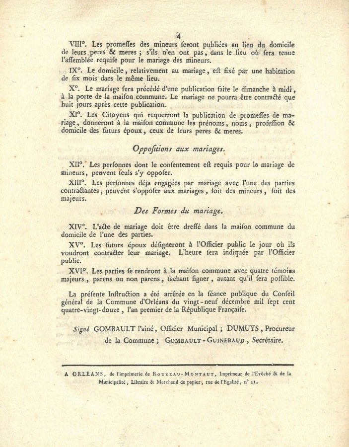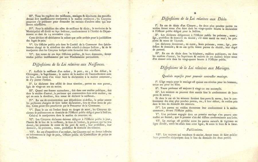 3° Tous les registres des naissances, mariages et sépultures des paroisses devant être incessamment transportés à la maison commune, les citoyens pourront s’y présenter pour demander des extraits d’anciens actes qui leur seront nécessaires. »