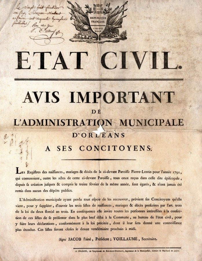 Ainsi, les registres paroissiaux rejoignent les collections publiques, l’administration municipale devient dépositaire des documents, elle est désormais chargée de leur conservation. La double collection déposée aux Archives départementales du Loiret a subi des pertes à la suite de l’incendie de juin 1940.