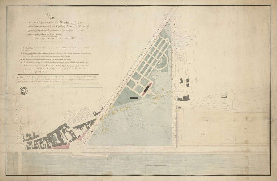 L'emprise du Jardin des plantes en 1841 (en vert foncé) et le projet de son extension juqu'à la Loire (en vert clair).