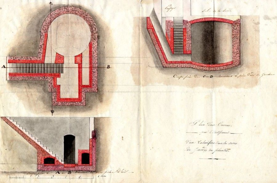 A partir de 1841, on établit un nouveau dispositif à courant d’air chaud dans le sous-sol de l’orangerie. Le calorifère est composé d’une cloche en fonte servant de foyer et de tuyaux propulsant l’air chaud jusqu’aux bouches qui permettent l’émission de chaleur.