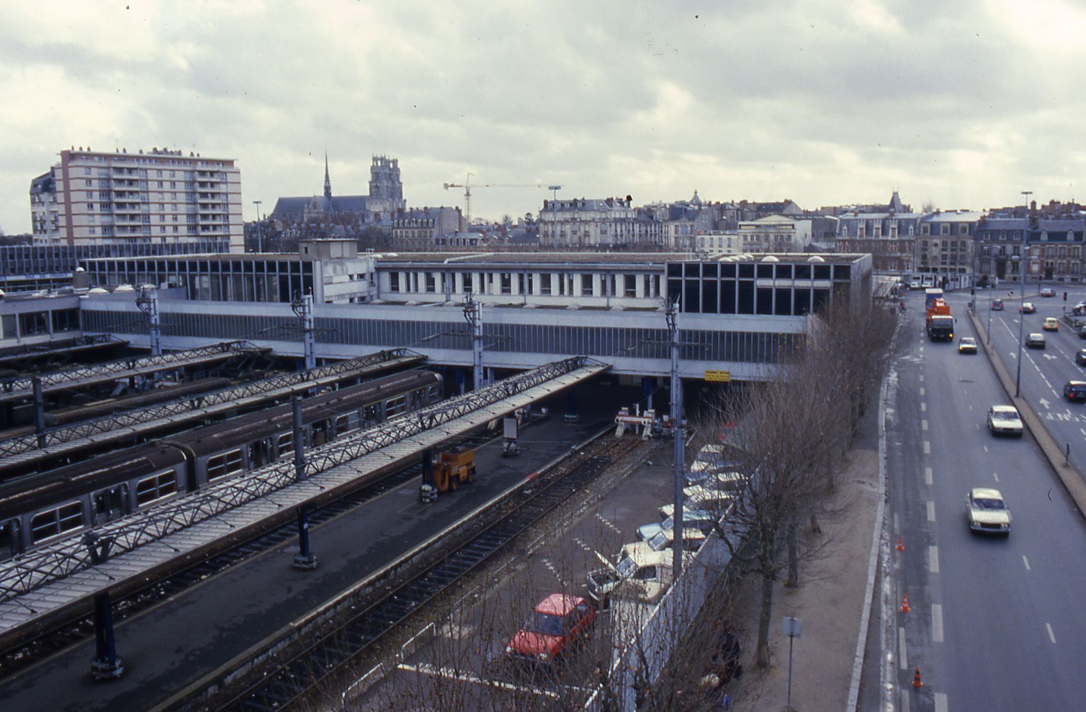 En 1940, le plan de reconstruction proposé par Jean Royer revient à nouveau sur la question de la gare unique. Les événements ne sont cependant pas favorables aux travaux. En 1944, la destruction de la gare des Aubrais et d’une partie des installations de celle d’Orléans donne l’opportunité de concrétiser ce projet. La question de la gare unique devient alors un des principaux enjeux de la reconstruction. Au départ, la Société Nationale des Chemins de fer Français qui a succédé à la Compagnie du P.O. en 1938, n’est pas d’accord avec l’urbaniste Jean Royer. Face à l’ampleur des reconstructions à prévoir au niveau national, il lui semble inutile de repenser la gare d’Orléans, peu touchée par les bombardements. Progressivement, la S.N.C.F. se laisse convaincre et en 1947, un projet est entériné par l’Etat.