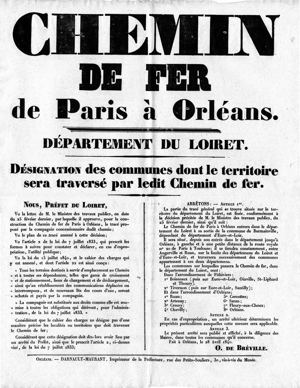 A partir de 1830, des tracés pour une voie allant de Paris à Orléans sont étudiés. Certains passent par la vallée de l’Essonne puis Malesherbes et Pithiviers, d’autres traversent la Beauce et desservent Etampes. En 1838, le Gouvernement retient l’idée du second tracé. Une ordonnance royale concède la construction à Casimir Lecomte, directeur des Messageries royales. Il fonde la « Compagnie du chemin de fer de Paris à Orléans », surnommée plus tard « P.O. ». La ligne, équivalant à 133 kilomètres, est construite en deux temps : dès 1838, Paris - Corbeil puis, après un arrêt pour cause de difficultés financières, les travaux reprennent en 1841 pour relier Juvisy, Etampes et Orléans. En 1843, la construction s’achève. Comme le demandait le cahier des charges initial, cinq ans auront été nécessaires pour relier Paris à Orléans.