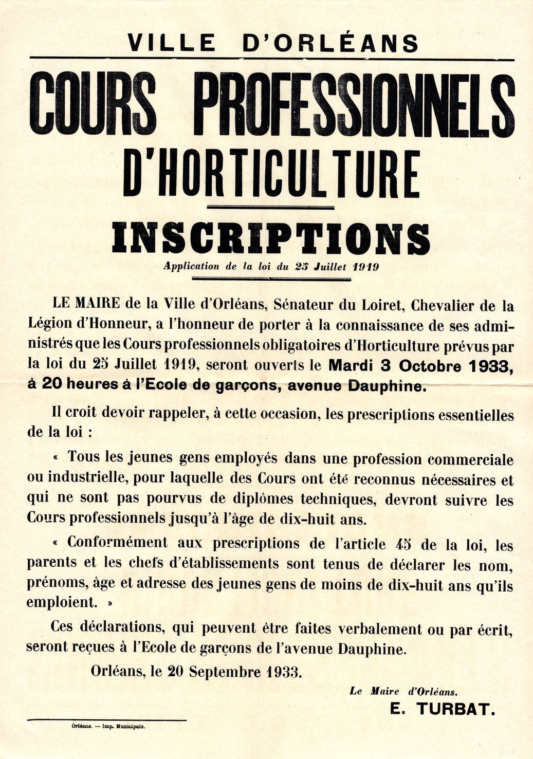 Dès 1896, des cours de greffage sont organisés au sud de la Loire par le Syndicat horticole du Loiret. Rapidement, des cours complémentaires pour les enfants de moins de treize ans voient le jour. La ville d’Orléans propose parallèlement des cours d’arboriculture pour adultes, professionnels ou amateurs.
