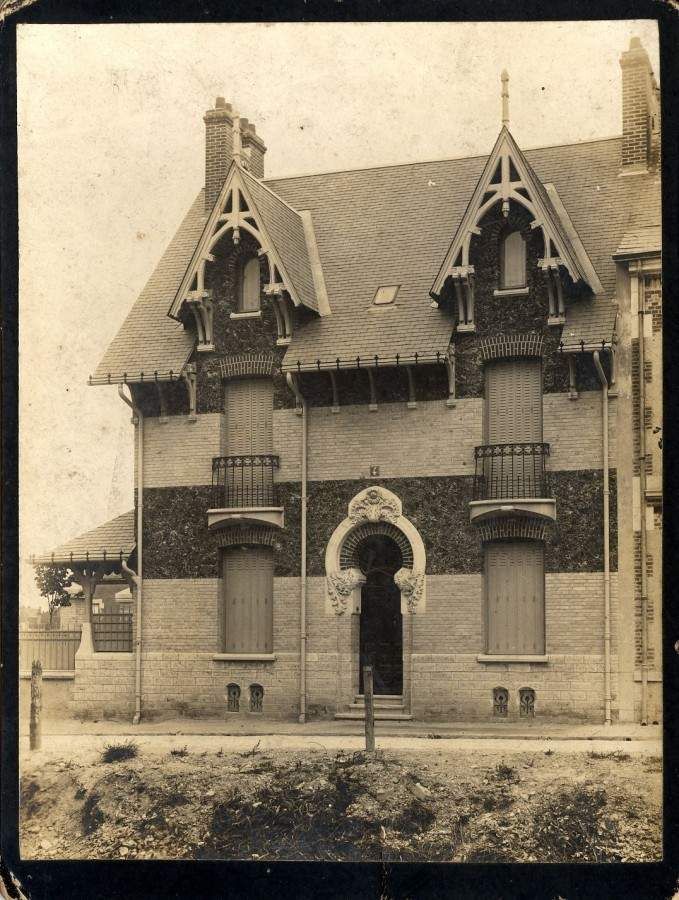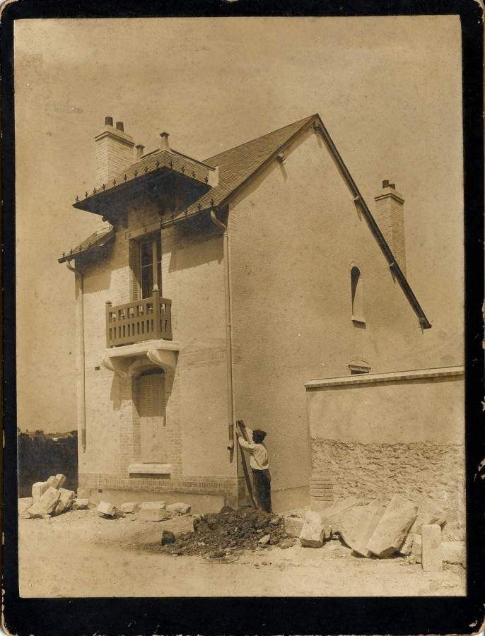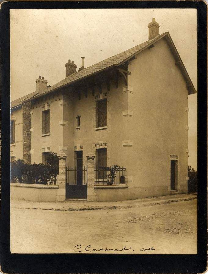 Ces 3 clichés montrent 3 maisons nouvellement réalisées, probablement dans le quartier Saint-Marceau. Sur l'une d'entre elles, une mention manuscrite indique "C. Coursimault, arch". Celui-ci est orléanais. Un autre cliché montre un ouvrier au travail devant une demeure quasiment achevée.