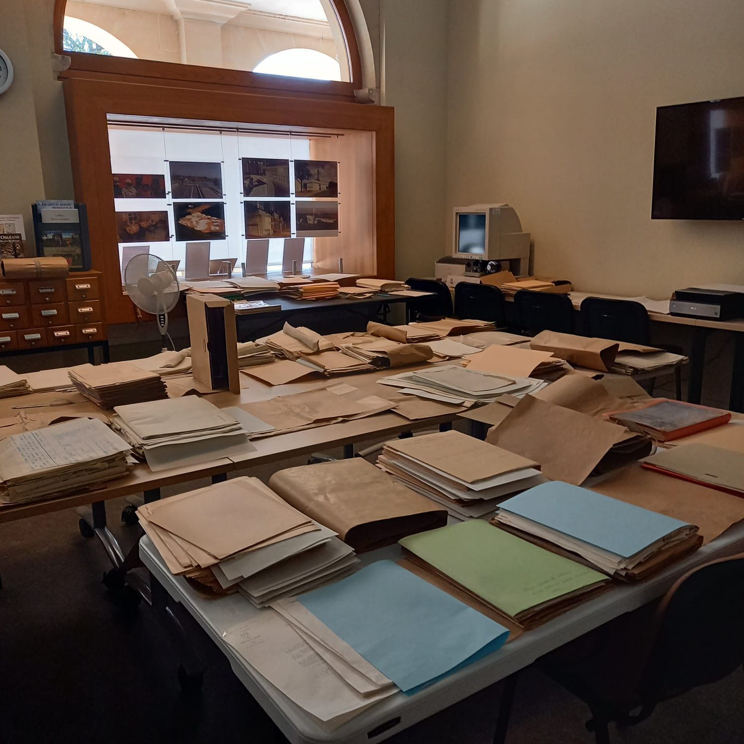 En effet, notre salle de consultation sert d'espace pour faire sécher les collections. Les agents présents changent aussi les conditionnements et établissent un état des lieux des cotes et pièces touchées.