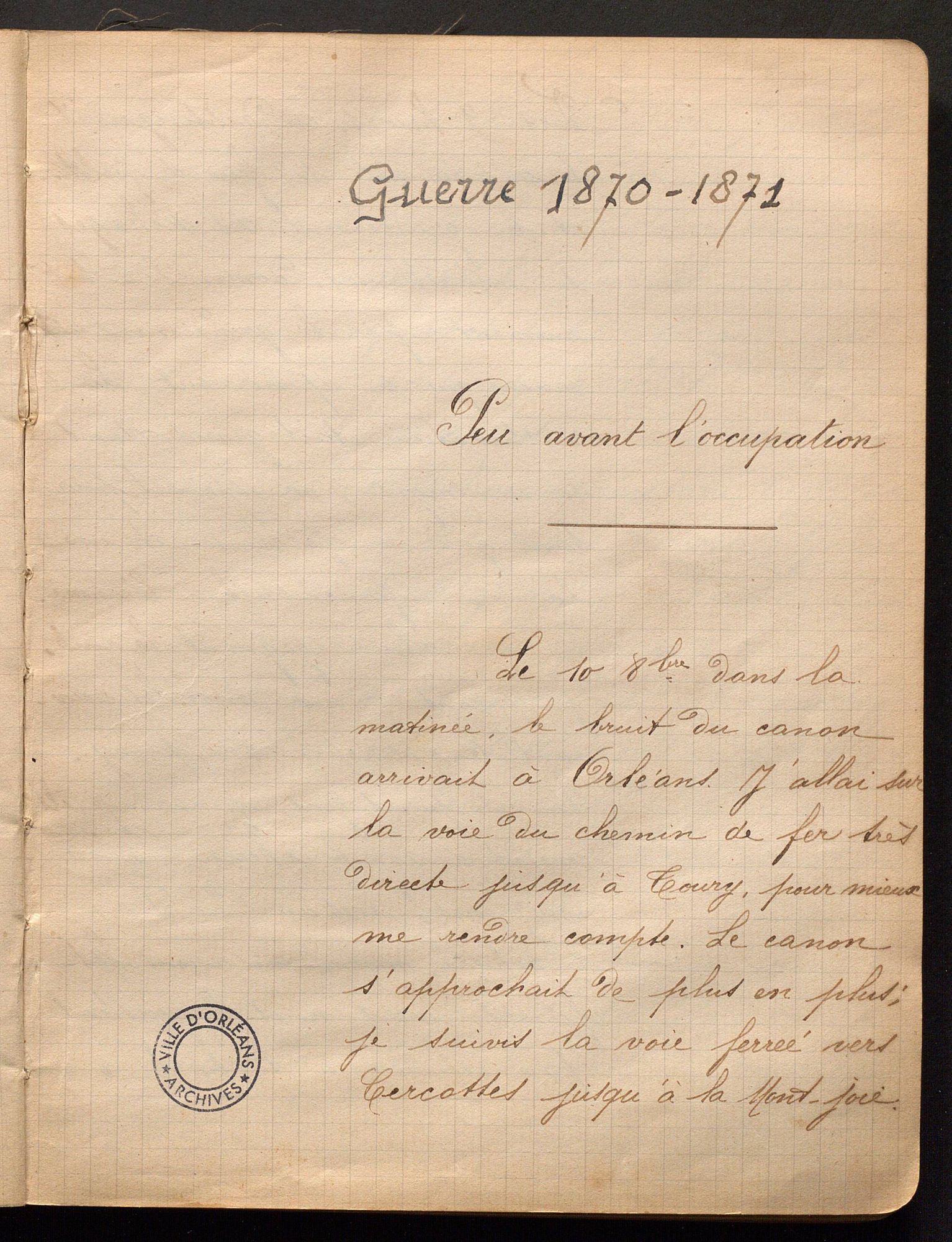 D'aspect extérieur, c'est un simple cahier donné aux Archives municipales en février 1995. A l'intérieur, c'est un récit manuscrit de 235 pages qui relate les évènements d’octobre et novembre 1870 dans le quartier des Aydes sur les communes d'Orléans, Fleury-les-Aubrais et Saran. Mais le texte n'est pas signé...