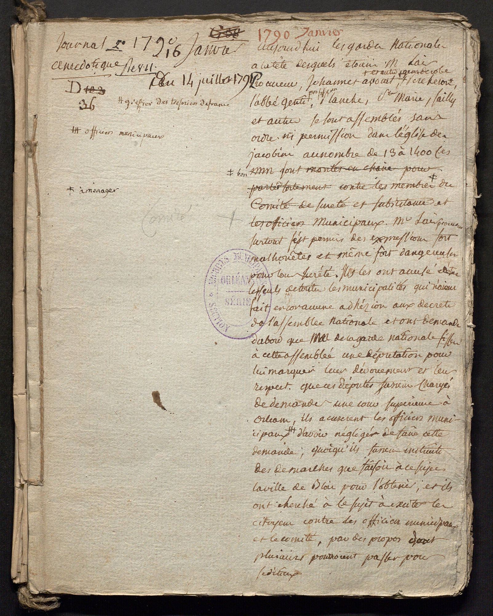 Ce document relate des événements survenus à Orléans et dans le Loiret entre le 16 juillet 1790 et le 14 juillet 1791. Il concerne la garde nationale principalement. On y trouve trace, entre autres, d'une inondation en septembre 1790, de troubles provoqués par le passage de troupes ou de la grève d'ouvriers en avril 1791, de l'annonce de la fuite du roi en juin 1791 ou encore d'incidents provoqués par des jeunes gens.