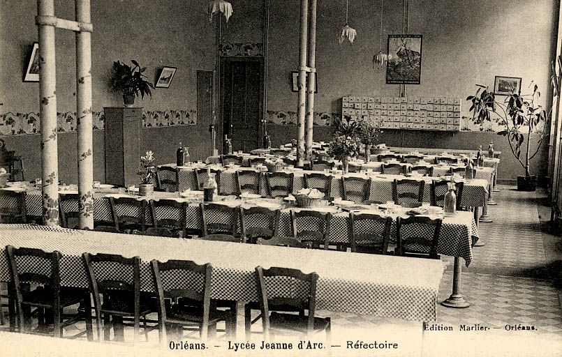 Le Lycée Jeanne d’Arc propose jusqu’à quatre repas par jour aux élèves suivant le régime scolaire auquel elles sont affiliées. Tous les repas ont lieu à heures fixes. A 8 heures, un café au lait ou un chocolat est servi. A 11H45, le déjeuner comprend un hors-d’œuvre, un plat de viande et de légumes et un dessert. A 16H, les jeunes filles reçoivent du pain et du chocolat ou des fruits. Enfin, à 19H, le dîner se compose invariablement d’un potage, d’œufs ou de jambon, de légumes et d’un dessert.