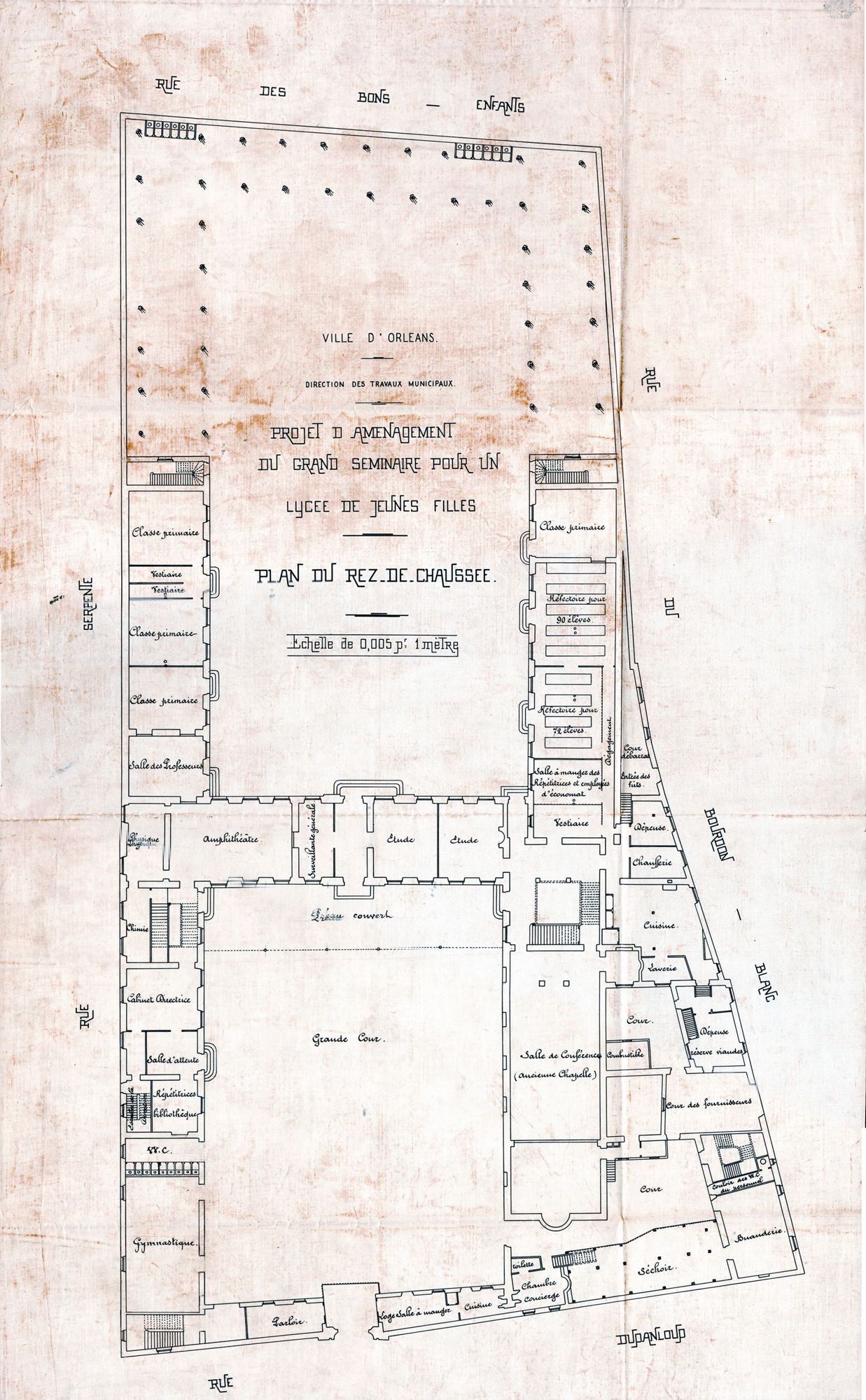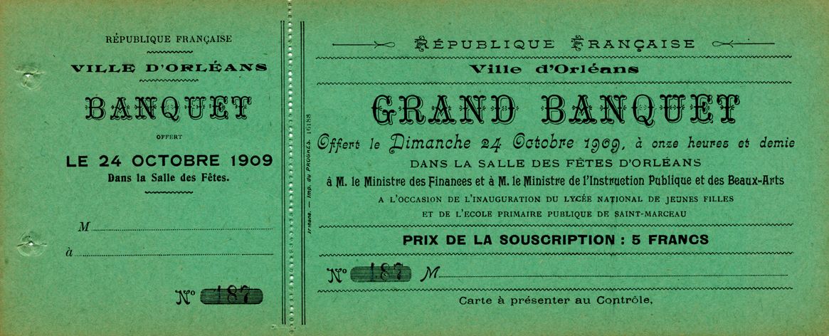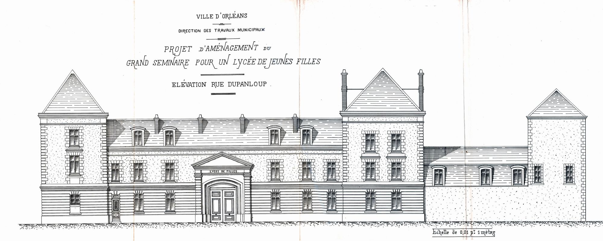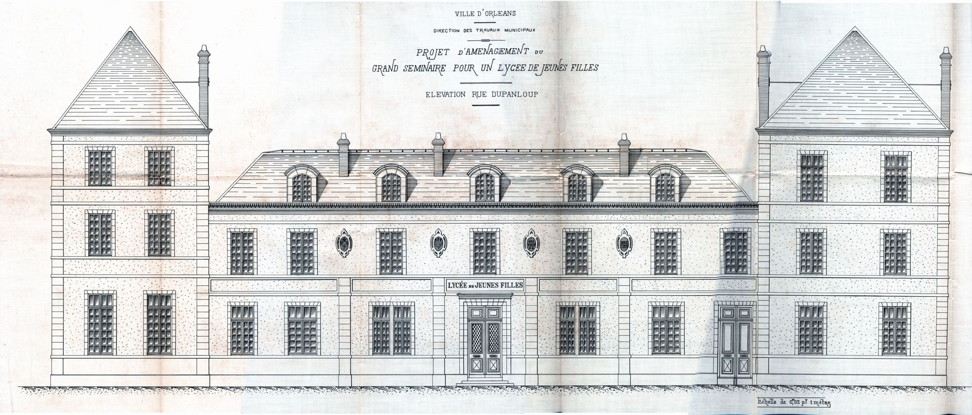 En 1880, la loi Camille Sée instaure l’enseignement secondaire à destination des filles. L’Etat créé des établissements avec le concours des départements et des villes. En 1907, la ville d’Orléans décide d’installer le lycée de jeunes filles dans l’ancien séminaire. La première rentrée se déroule le 11 octobre 1908 après de nombreux travaux. Ainsi le mur et l’entrée monumentale laissent place à une façade ornée des emblèmes des quatre villes les plus importantes du Loiret : Orléans, Montargis, Pithiviers et Gien. Quatre dortoirs et onze classes peuvent accueillir jusqu’à cinq cents élèves.
