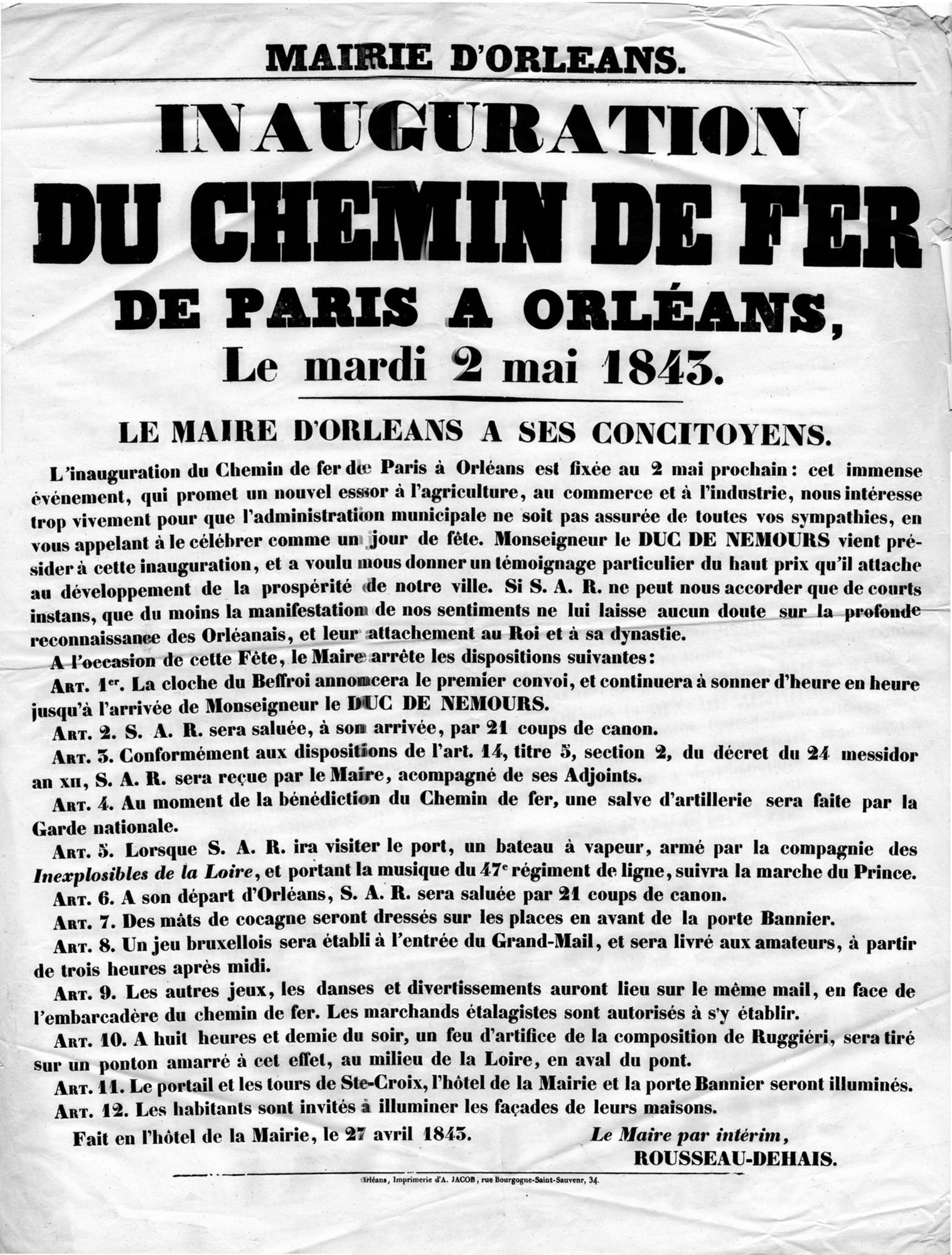 L’arrivée du chemin de fer est un jour de fête. Elle est présentée comme un immense événement qui promet un nouvel essor à l’agriculture, au commerce et à l’industrie. Le beffroi retentit, le cortège inaugural est salué par 21 coups de canon et la bénédiction de l’édifice par Monseigneur Fayet, évêque d’Orléans, est accompagnée d’une salve d’artillerie. Parallèlement, des divertissements sont proposés aux habitants et le soir, un feu d’artifice clôture la journée.