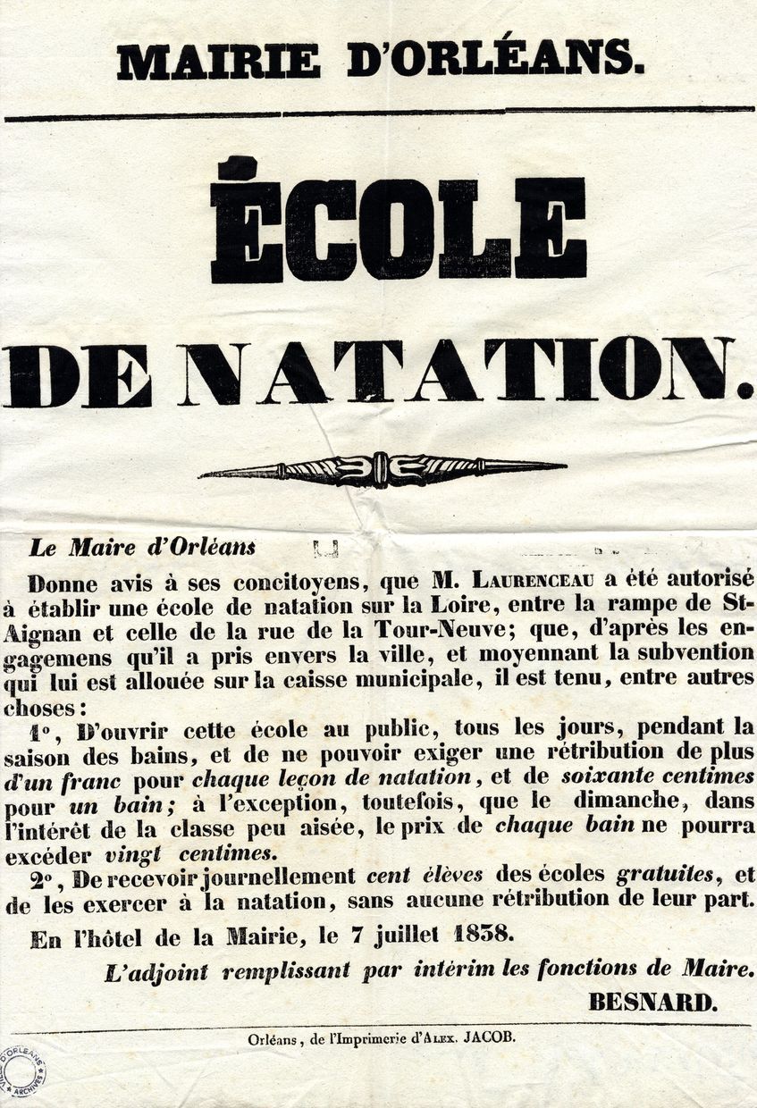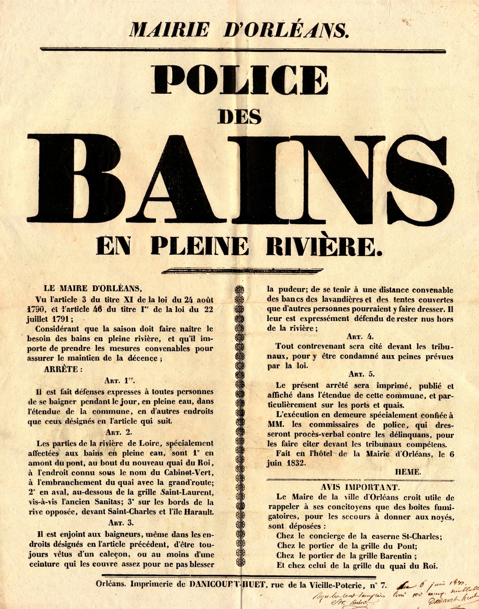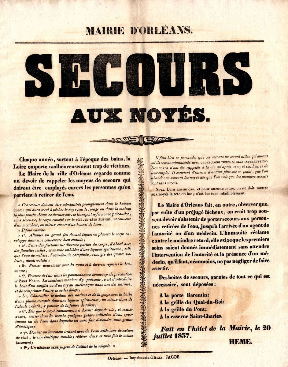 Dès le XIXe siècle, la municipalité diffuse des affiches permettant de localiser les boîtes de secours et d’informer les Orléanais sur les premiers soins à donner en cas de noyade.