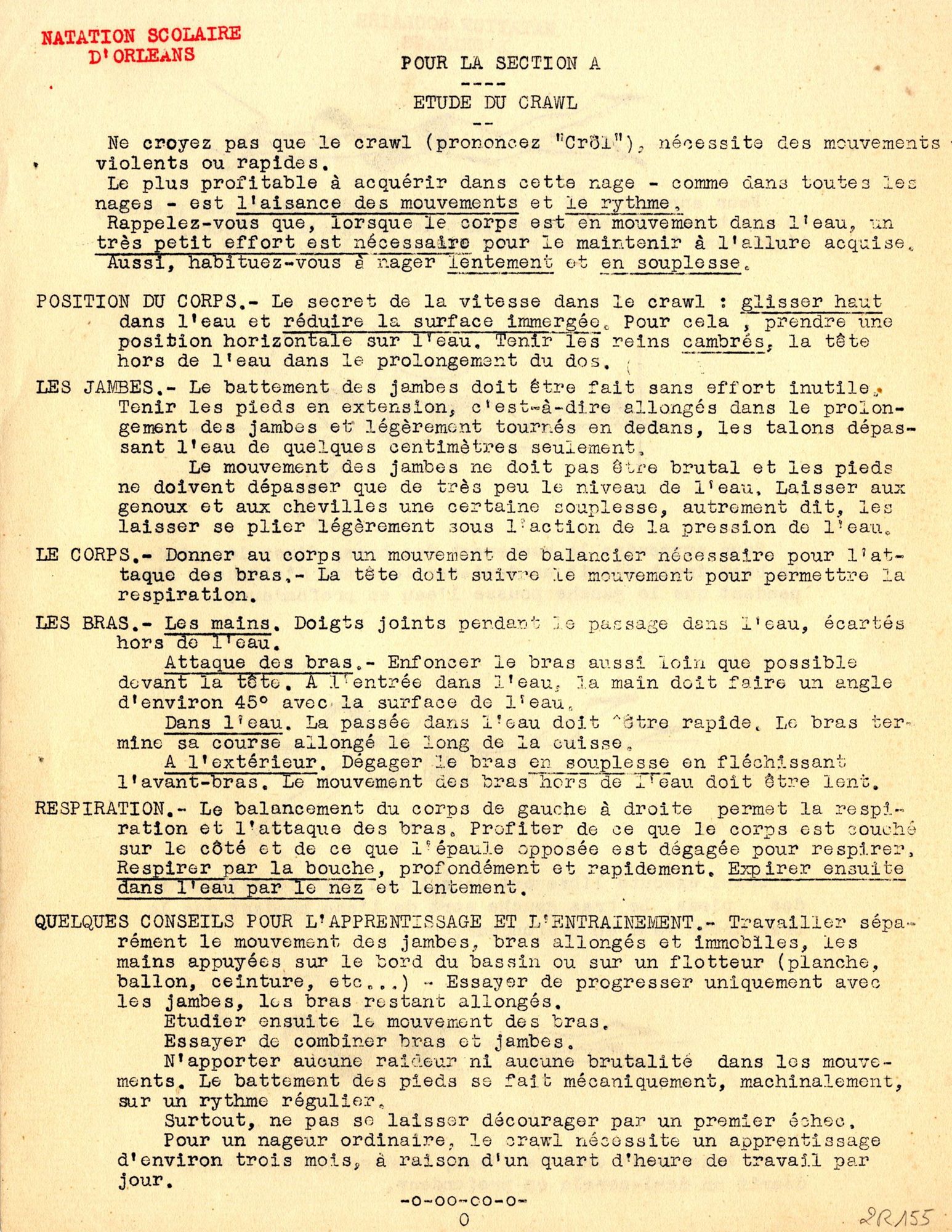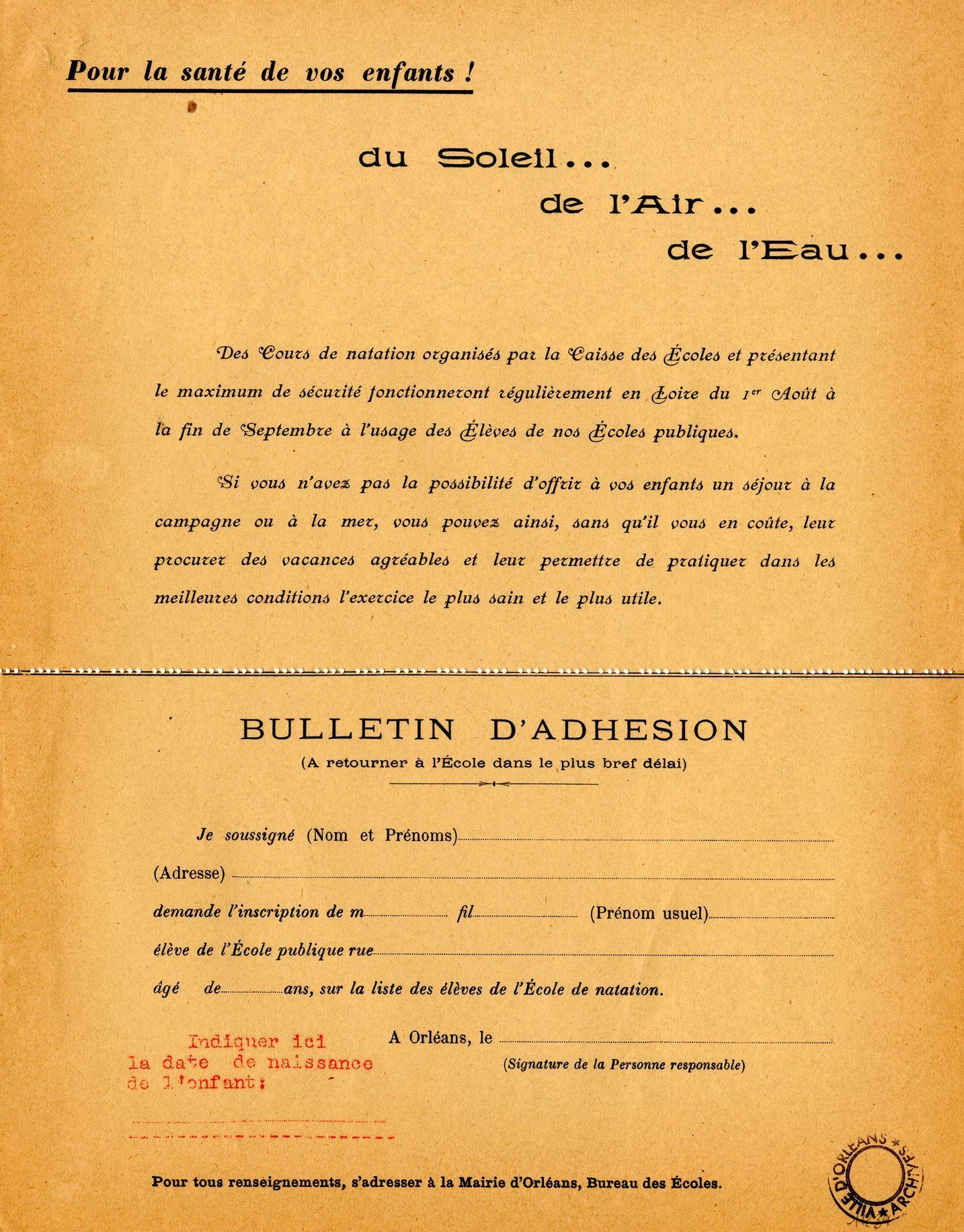 En 1927, sur l’initiative de Théophile Chollet, maire de l’époque, une section natation est créée au sein de la Caisse des écoles publiques d’Orléans. Ainsi, ce sport est décrit comme « distrayant, utilitaire, contribuant au développement physique de l’enfant et entretenant ses qualités morales » à savoir le « goût de l’effort et du risque ». Tous les enfants entre 10 et 14 ans inscrits dans une école publique de la ville peuvent adhérer. Les cours ont lieu tous les jours d’août et septembre sauf le dimanche. Pour les garçons, ils se déroulent les matins et, pour les filles, l’après-midi.