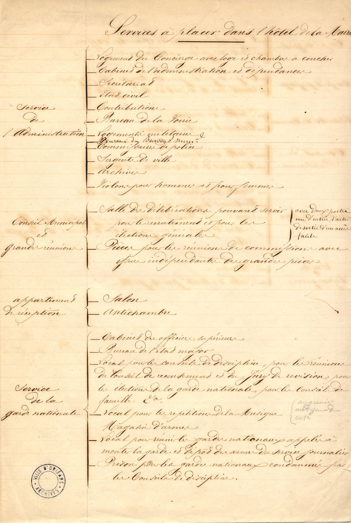 En 1790, la municipalité abandonne l’hôtel des Créneaux pour s’installer place de l’Etape, dans l’hôtel Groslot. Construit au milieu du XVIe siècle, l’édifice est destiné à la résidence privée du bailli Jacques Groslot. Par la suite, il abrite les services de l’intendant de la généralité d’Orléans jusqu'à la Révolution.