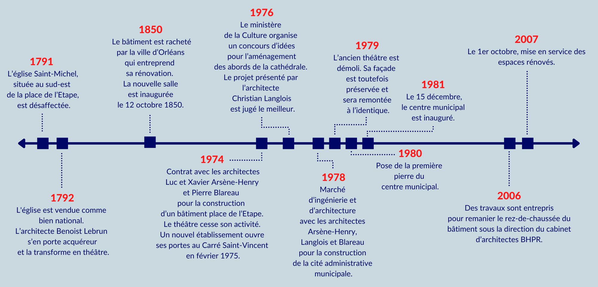 Au cours des années 1970, un nouveau bâtiment est projeté au sud-est de la place de l’Etape, sur l’emprise du théâtre, d’une rue et de quelques immeubles contigus.