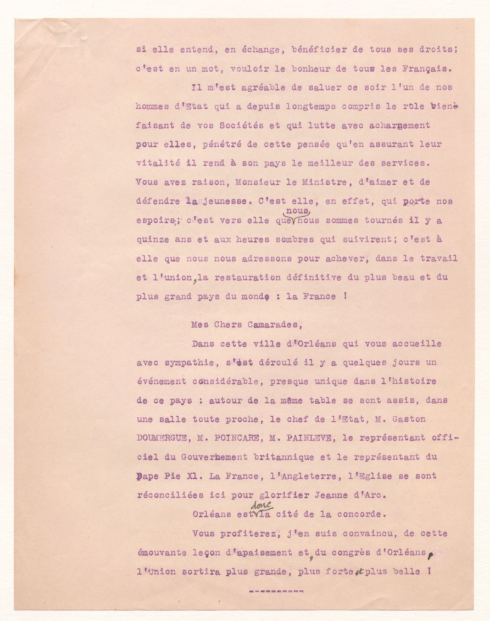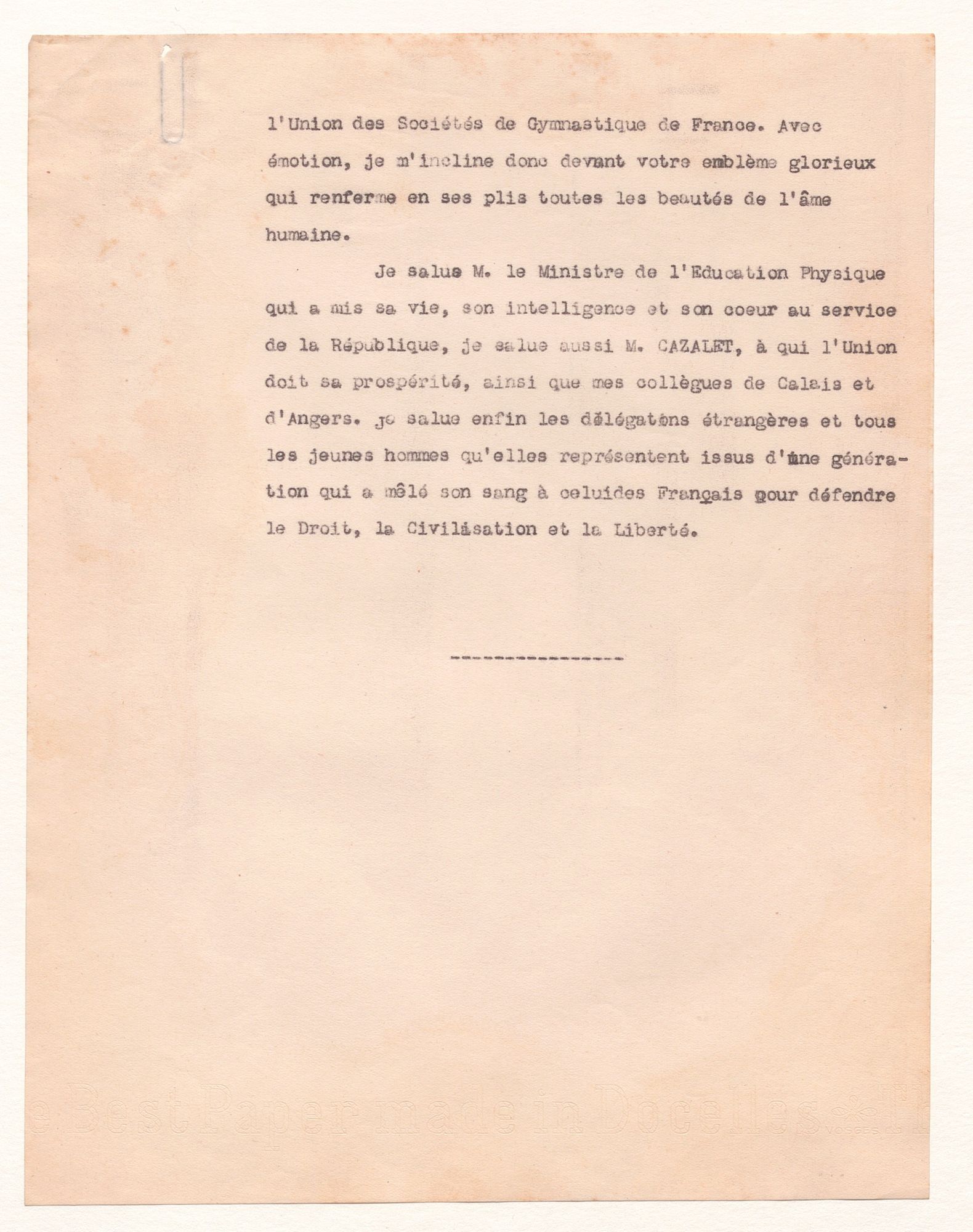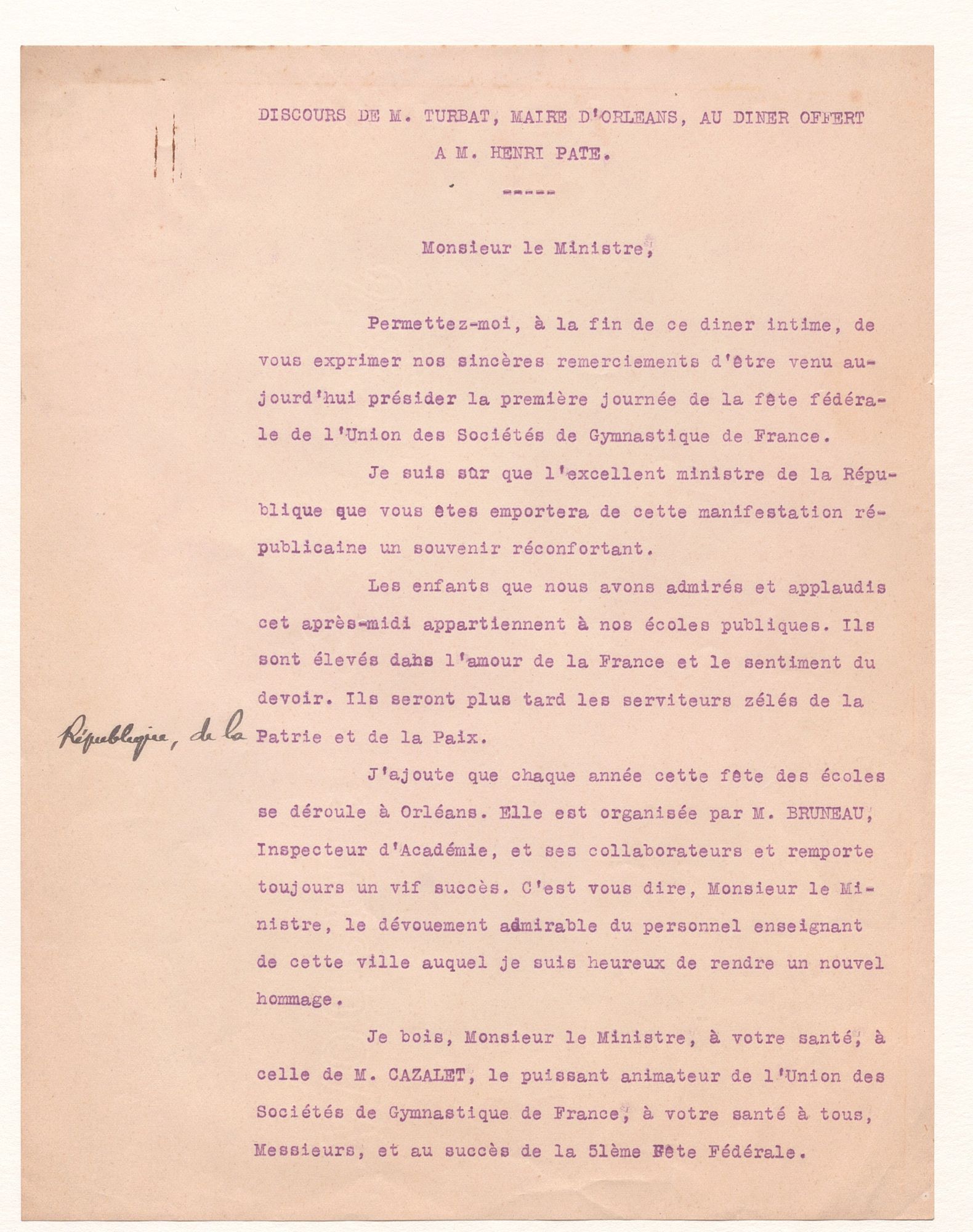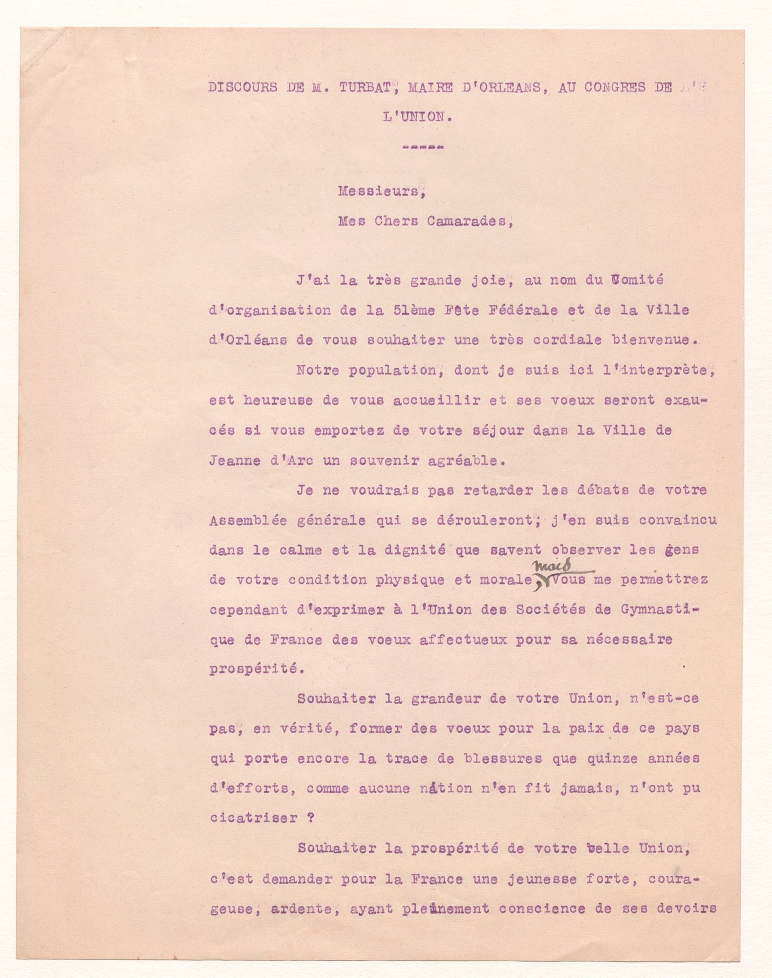 Eugène Turbat rappelle les Fêtes de Jeanne d'Arc, dans lesquelle la Fête fédérale de gymnastique est intégrée. Ce discours, particulièrement marqué par le souvenir de la guerre, met l'accent sur la paix entre les pays d'Europe et salue encore une fois la jeunesse.