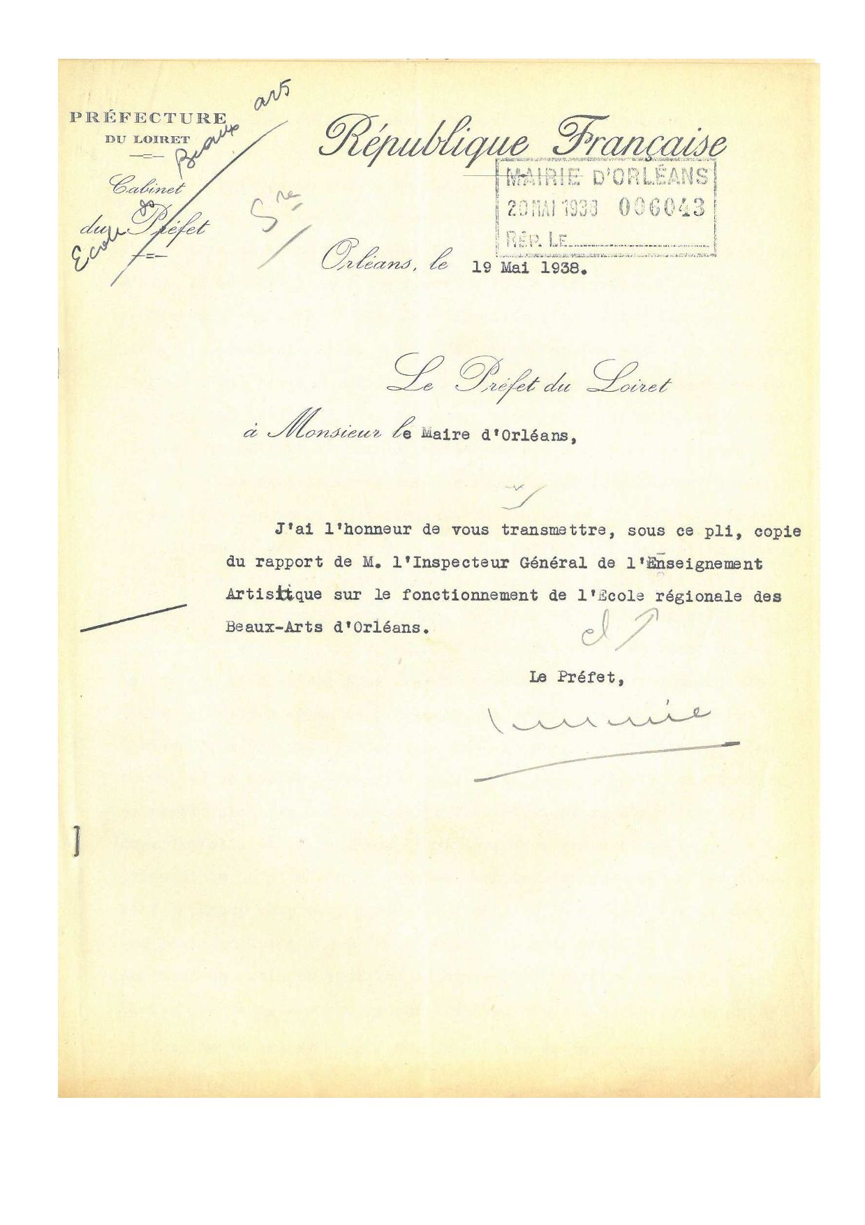 Un programme de réfection des locaux est approuvé en séance du conseil municipal du 26 mars 1937, ainsi que d’acquisition de matériel, de nouveaux modèles et d’outillage pour les cours professionnels, mais cette décision est ajournée. En 1938, le rapport de l’inspecteur général de l’enseignement artistique, Claude Roger-Marx, est catégorique : divisée en 4 bâtiments, en 4 tronçons, l’école d’Orléans mériterait un local plus digne d’une ville de cette importance et plus capable de créer une atmosphère d’Art. La construction d’une nouvelle école s’impose.