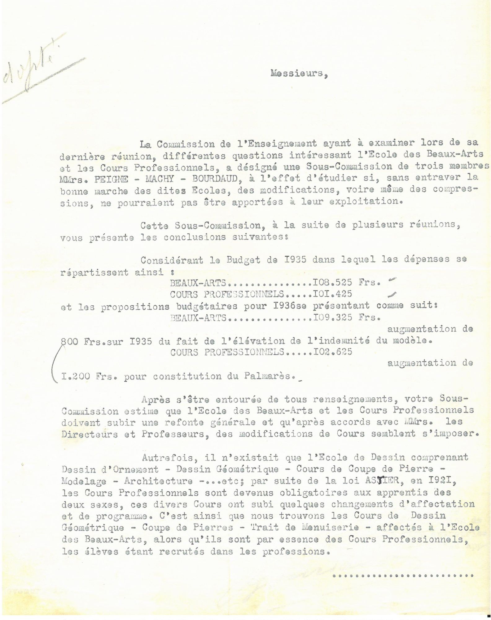 C’est en 1932 que Monsieur Besnard, directeur, démissionne pour raison de santé. A cette occasion, il évoque la difficulté de juxtaposer au sein d’un même établissement, les cours professionnels obligatoires institués en 1921 et l'enseignement artistique. L’éventualité de créer une direction adjointe est alors évoquée par le maire.