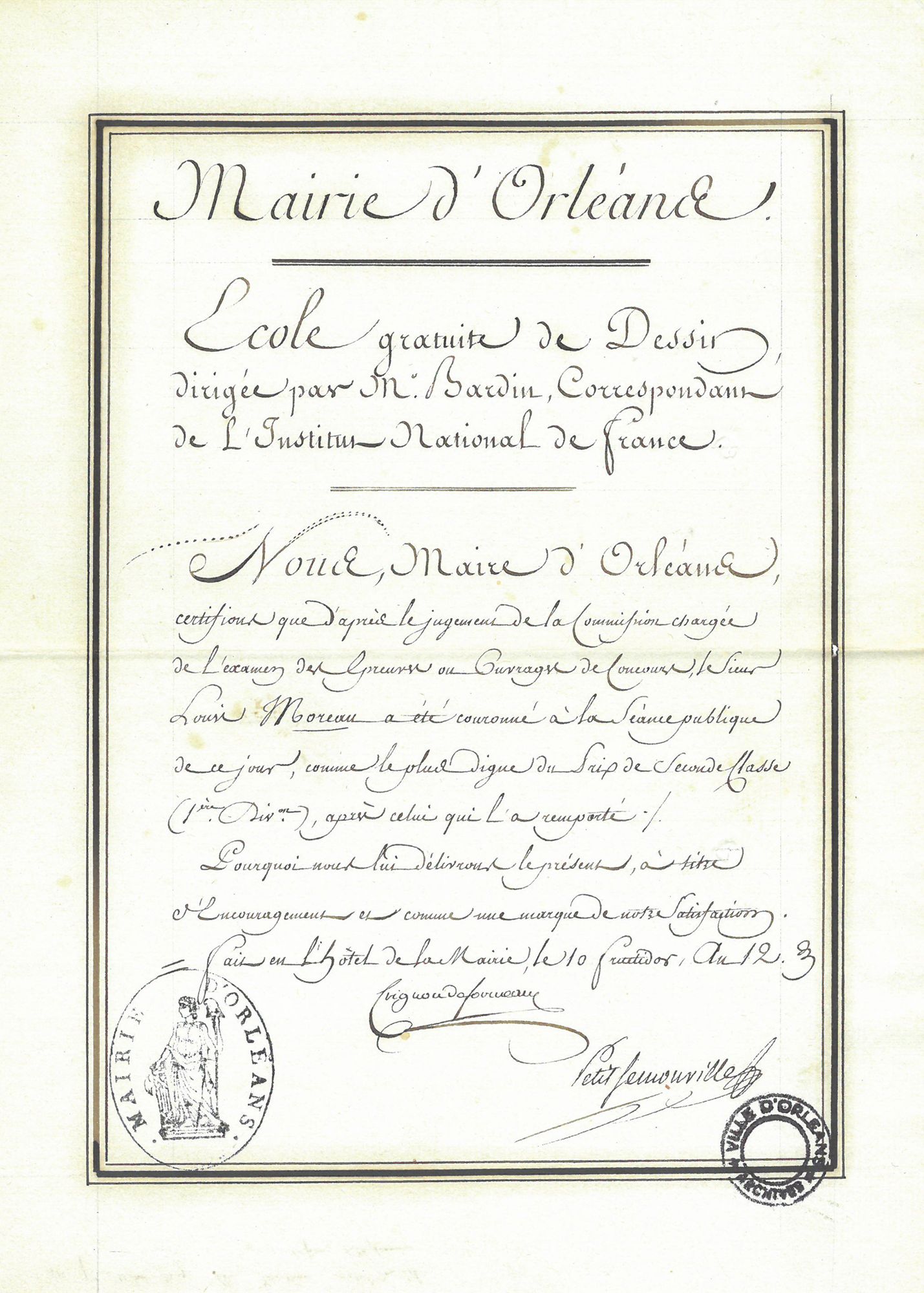 C’est dans son testament du 7 octobre 1846, que l’orléanais François-Pierre Ladureau lègue 500 francs de rente annuelle en faveur de l’Ecole de dessin et d’architecture. Il souhaite que cette rente soit remise tous les ans à l’un des jeunes gens qui se seront le plus distingués et dont les professeurs auront fait le choix. Après le décès de François-Pierre Ladureau, sa veuve Eulalie Lebrun créé un prix de 100 francs en faveur d’un élève du cours de modelage.