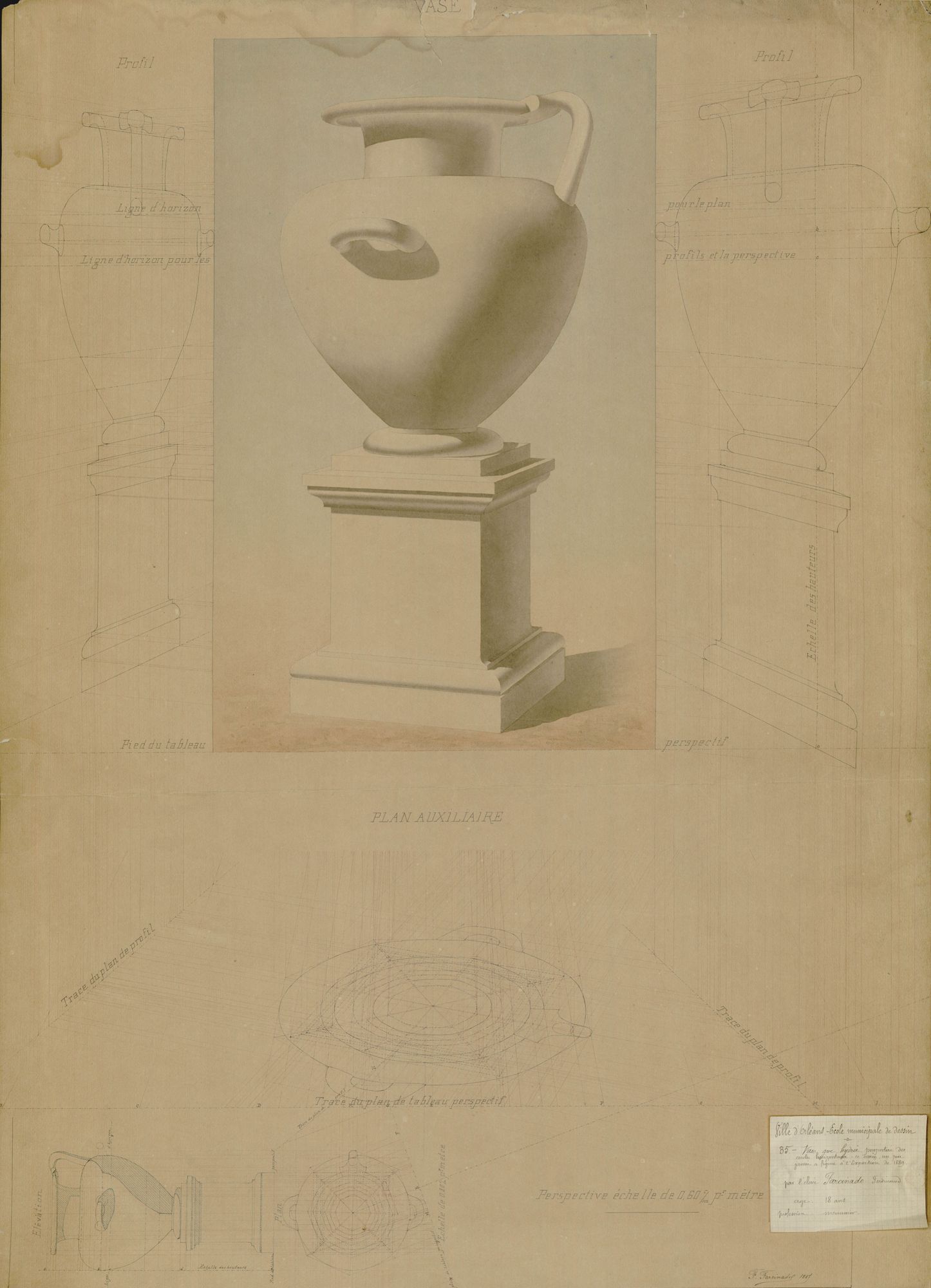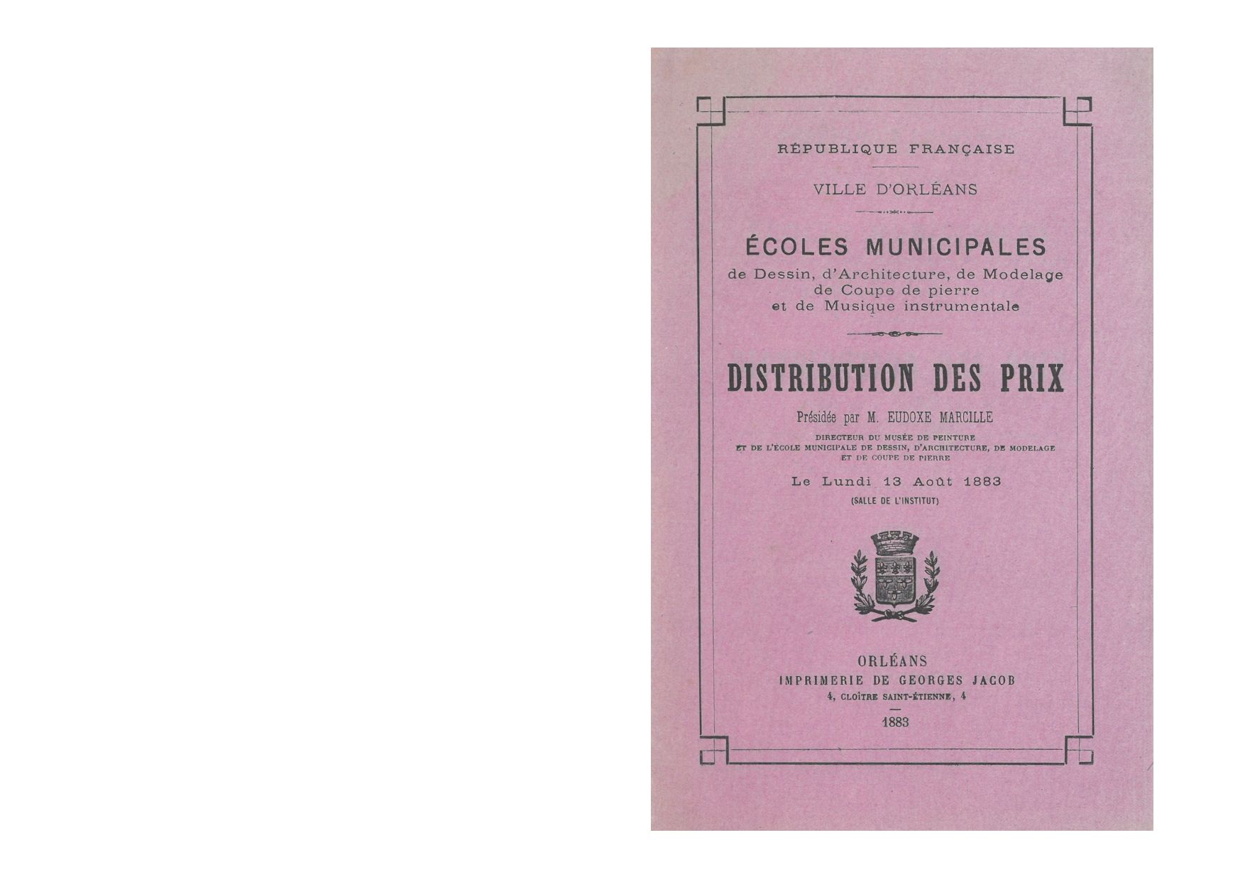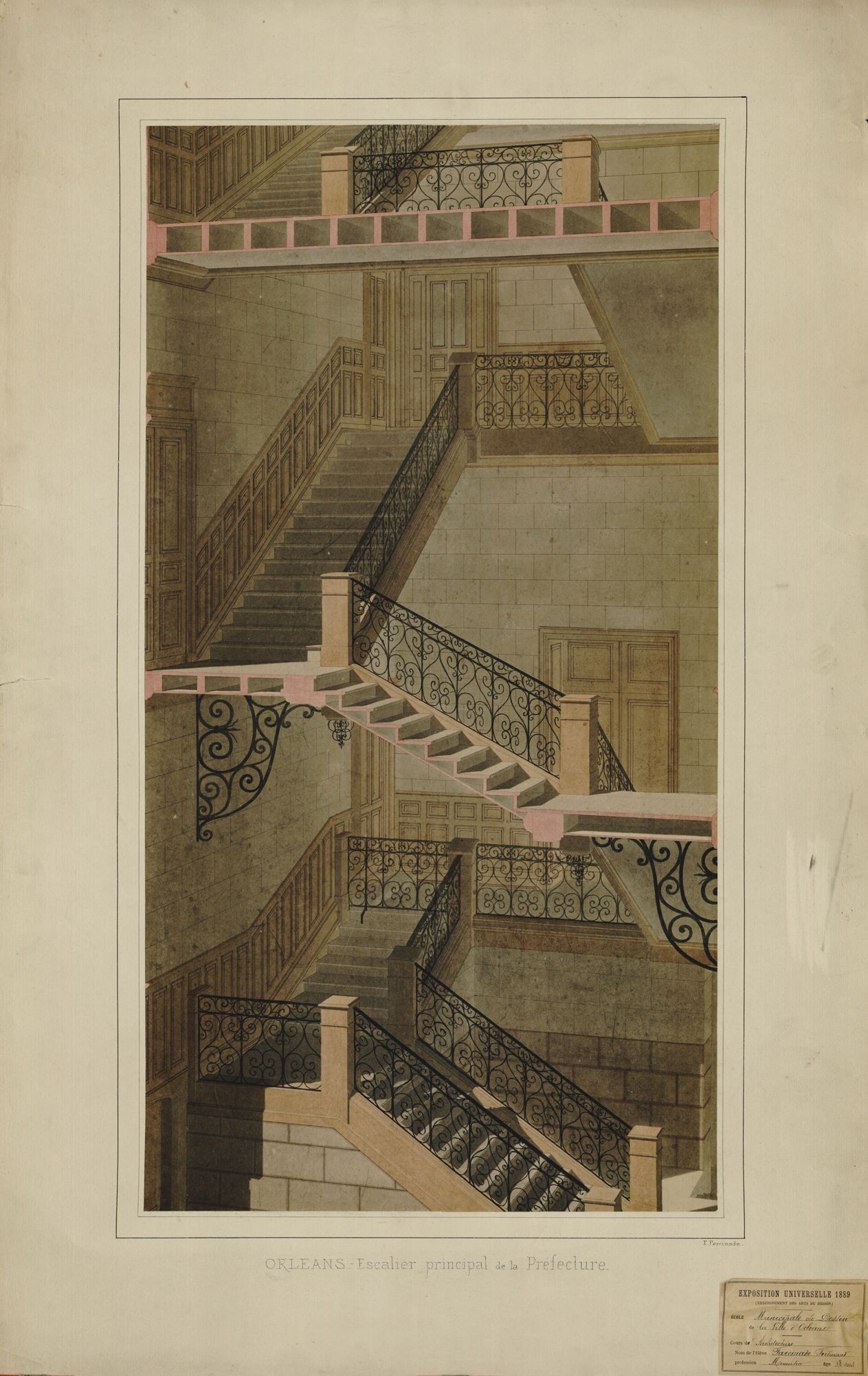 Parmi les élèves très distingués, le jeune Ferdinand Farcinade en classe d’architecture, menuisier, représente l’Ecole de dessin d’Orléans à l’Exposition universelle de 1889 avec une série de ses remarquables dessins.