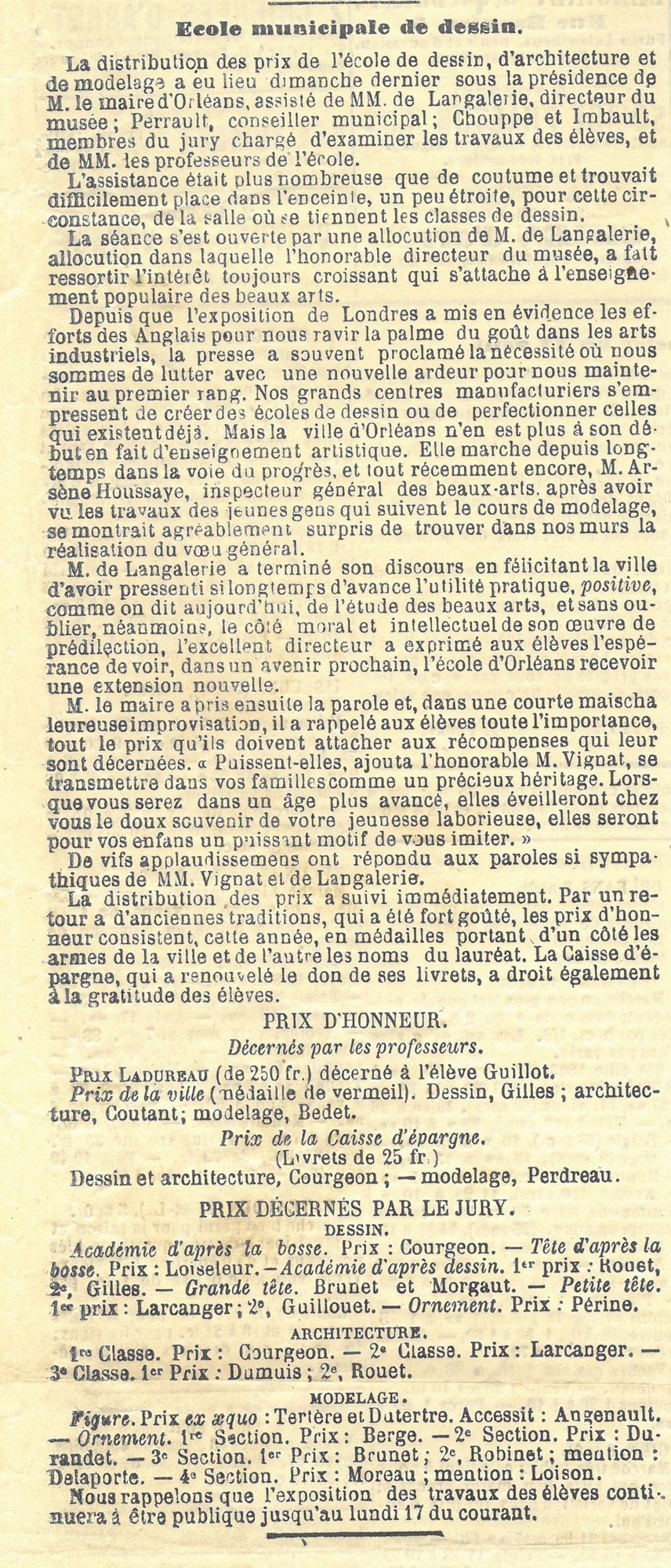 D’autres prix honorifiques sont créés à l’initiative de donataires privés ou publics : la médaille de vermeille de la Ville d’Orléans et celle du libraire-éditeur orléanais Alphonse Gatineau, le prix du ministère de l’Instruction publique, le livret d’honneur de 20 francs offert par la Caisse d’épargne, le prix de la Société des architectes d’Orléans, de la Société des amis des arts, de la maison Conté.