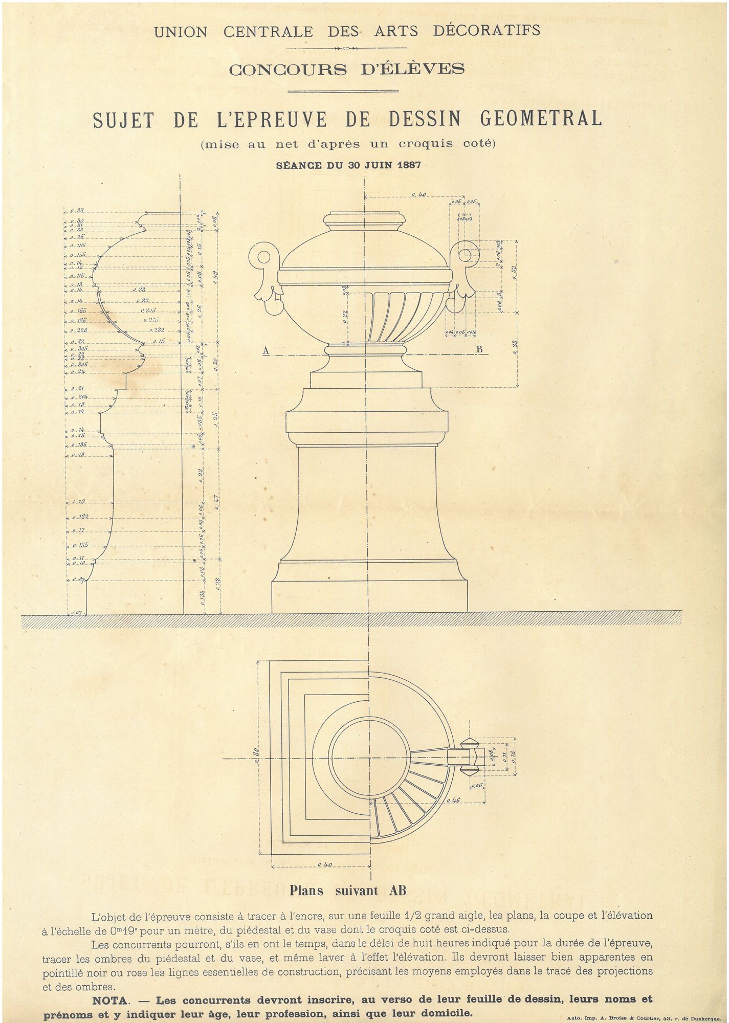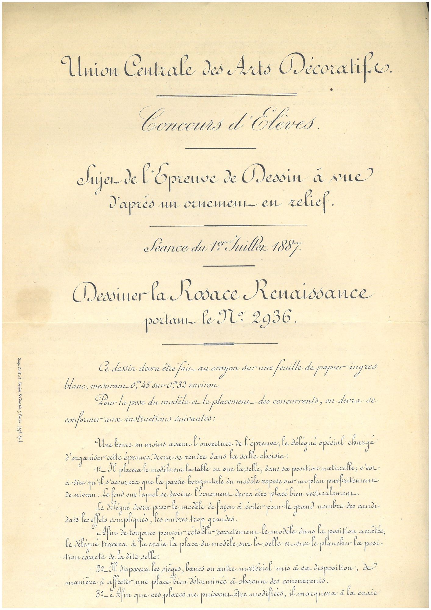 Les élèves peuvent également participer à des concours extérieurs au niveau régional ou national, tel celui de la Société d’encouragement à l’Art et à l’Industrie. L’Union centrale des Arts décoratifs organise le premier concours d’élèves en 1887, avec l’aide du ministère de l’Instruction publique et des Beaux-Arts. Après avoir obtenu l’autorisation du maire, les élèves passent les premières épreuves éliminatoires en province dans leurs villes d’attache. Les candidats désignés peuvent alors prendre part au concours à Paris, leur voyage aller-retour en 3ème classe leur étant remboursé avec le versement d’une indemnité journalière.
