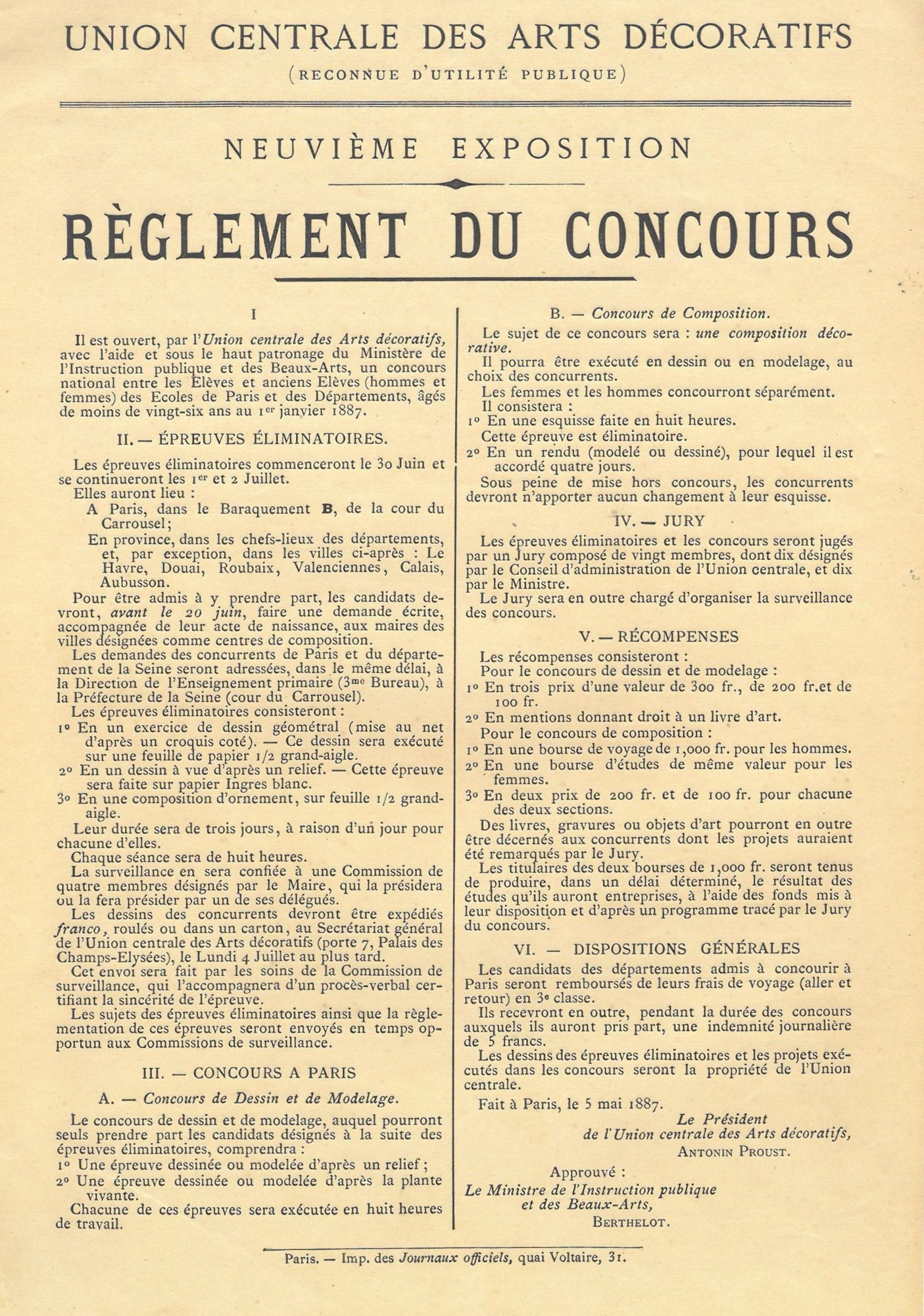 Les récompenses se répartissent en prix d’une valeur de 100, 200 et 300 francs, en remise de livres d’art, de gravures ou objets d’art, en l’attribution d’une bourse de voyage pour les hommes et d’une bourse d’étude pour les femmes d’une valeur de 1 000 francs chacune.
